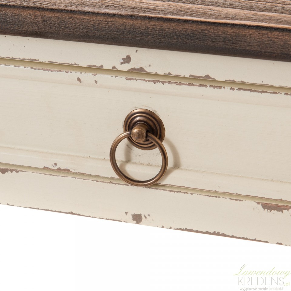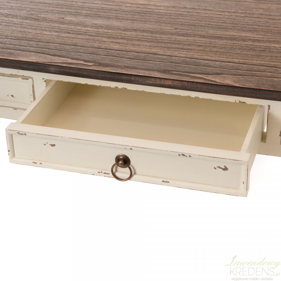 Zaproś prowansalskiego ducha do swojego biura lub gabinetu za pomocą tego designerskiego biurka. Umieszczone na wspaniałych, prostych nogach, biurko prowansalskie Mindi emanuje naturalnością i elegancją. Delikatne i proste linie, postarzenia oraz modne kolory (kremowy i brązowy) nadają mu charakteru antycznego mebla. Biurka prowansalskie tworzą przestrzeń idealną do nauki, do pracy oraz do zajęć kreatywnych. Proste i praktyczne, oferuje dużą powierzchnię roboczą na długim blacie, na którym możesz postawić lampkę biurkową, pojemnik na długopisy i komputer. Takie meble w stylu prowansalskim cenią sobie nasi klienci!
