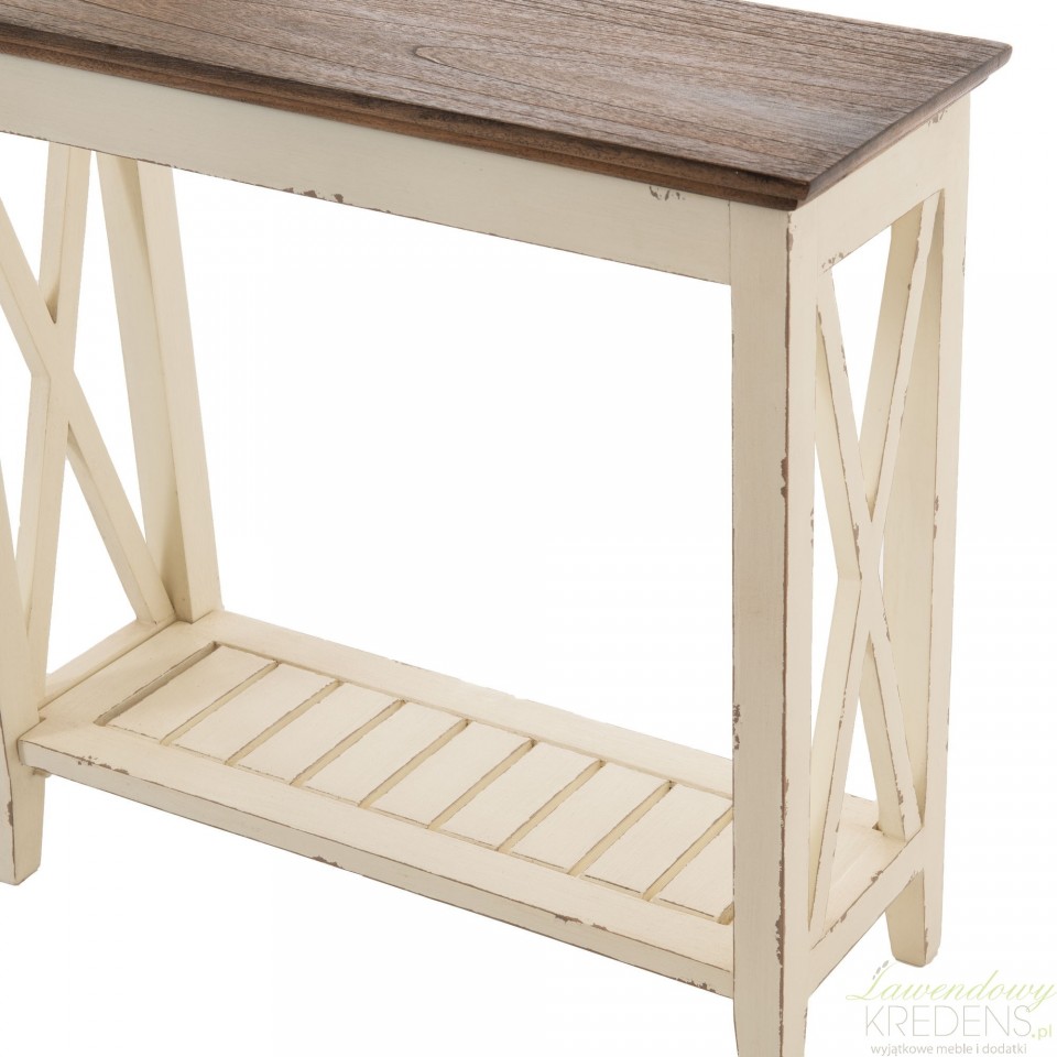 Elegancja, którą charakteryzuje się konsola prowansalska Mindi tkwi w designerskim wyglądzie kremowych nóg i brązowego blatu.