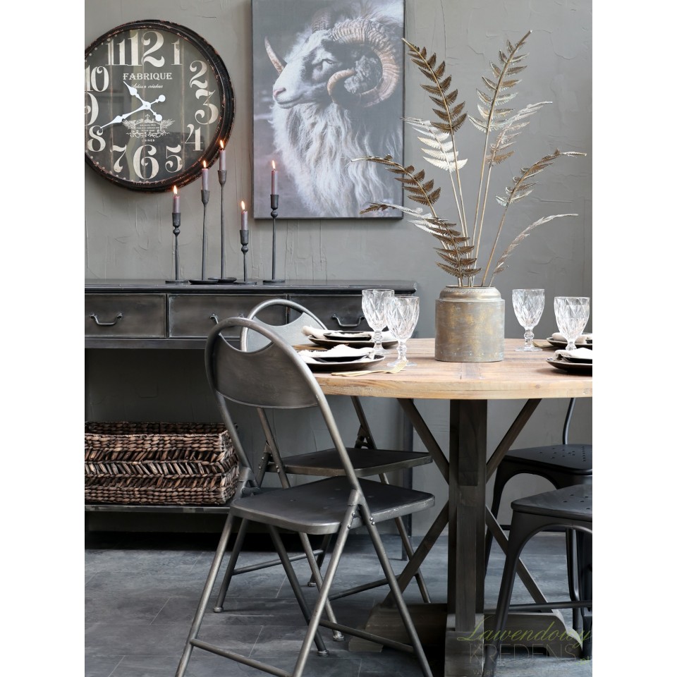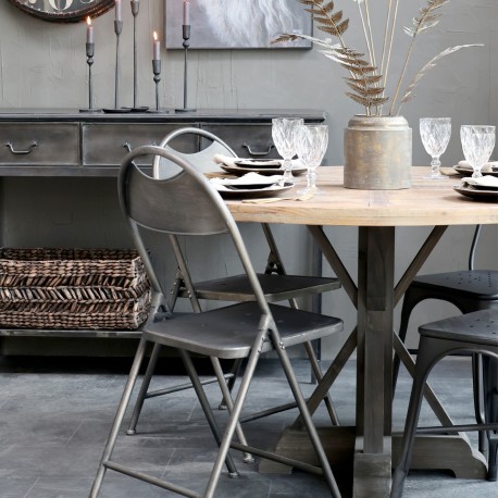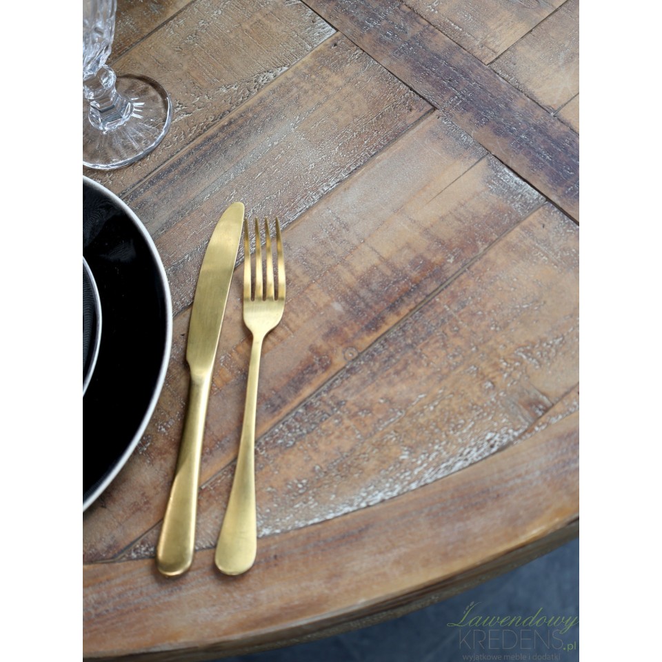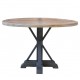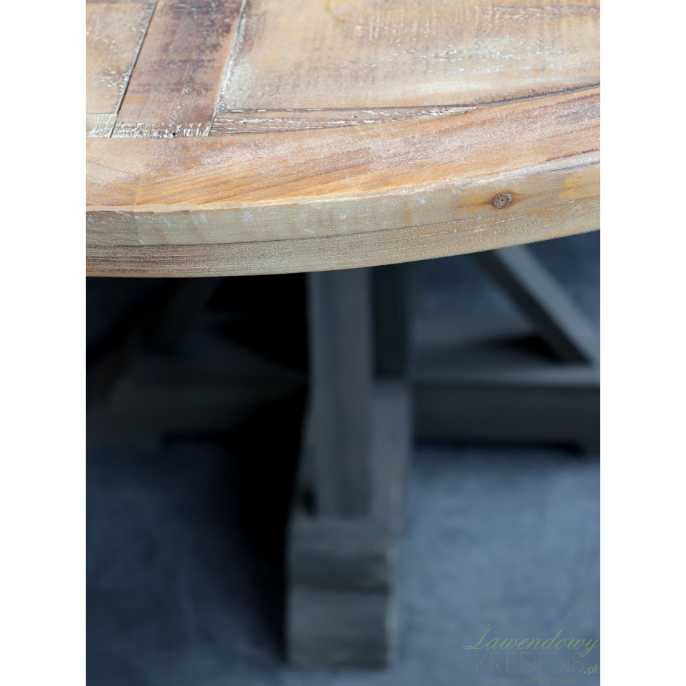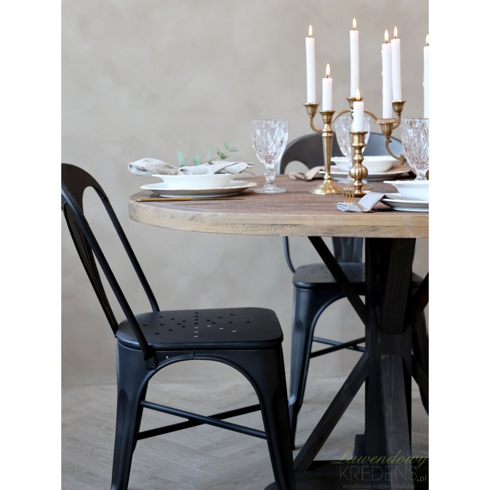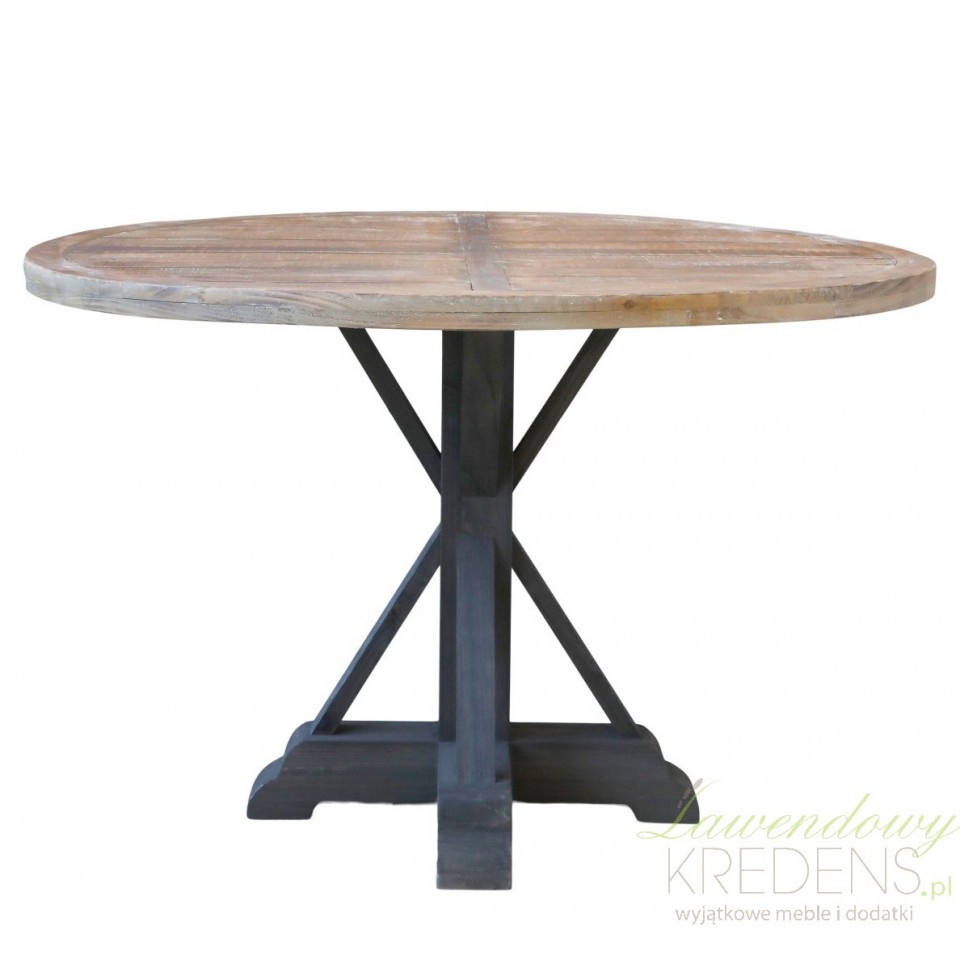 Oto drewniany stół okrągły Chic Antique, z masywną, czarną podstawą i brązowym blatem. Jest skropiony wyrazistymi postarzeniami.