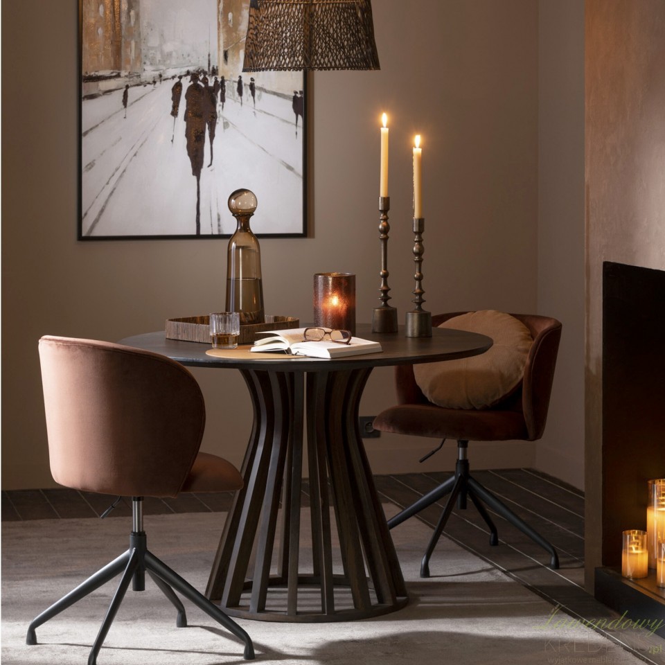 Jedną z najbardziej imponujących cech tego stołu jest jego noga. Składa się ona z drewnianych, podłużnych elementów, które tworzą unikalny wzór i dodają mu charakteru. Ta nietuzinkowa konstrukcja sprawia, że stół jest nie tylko stabilny, ale również wyjątkowy w swoim designie. Okrągły kształt stołu sprzyja swobodnym rozmowom i integracji, tworząc idealne miejsce do spotkań rodzinnych, przyjęć czy romantycznych kolacji we dwoje. Jego średnica jest dostosowana tak, aby zapewnić odpowiednią przestrzeń dla wszystkich gości.
