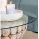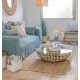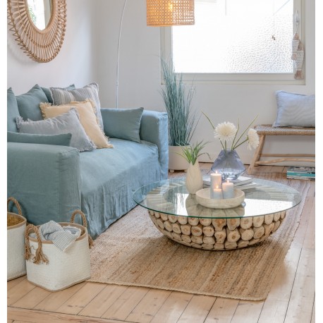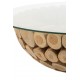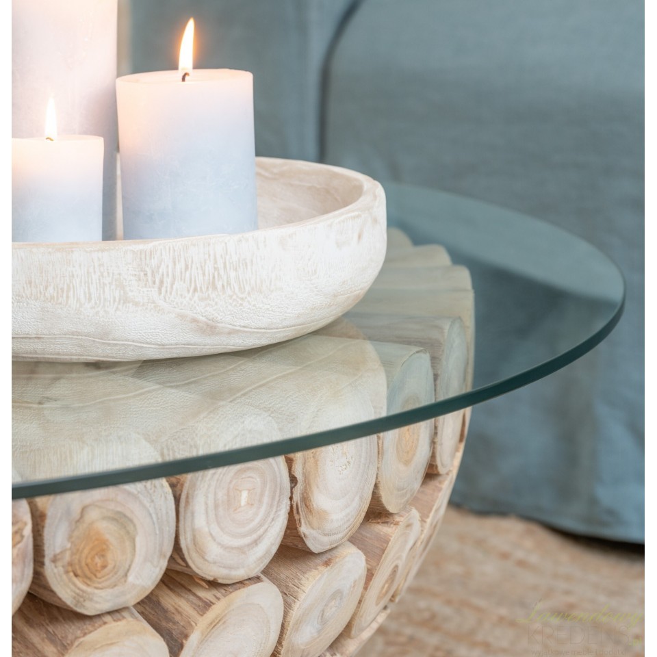 Okrągły stół kawowy marki J-Line o rustykalnym charakterze i unikalnym designie jest wyjątkowym elementem wyposażenia wnętrza. Jego szklany blat nie tylko dodaje lekkości i elegancji, ale również umożliwia podziwianie piękna drewnianej podstawy.