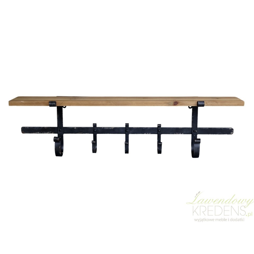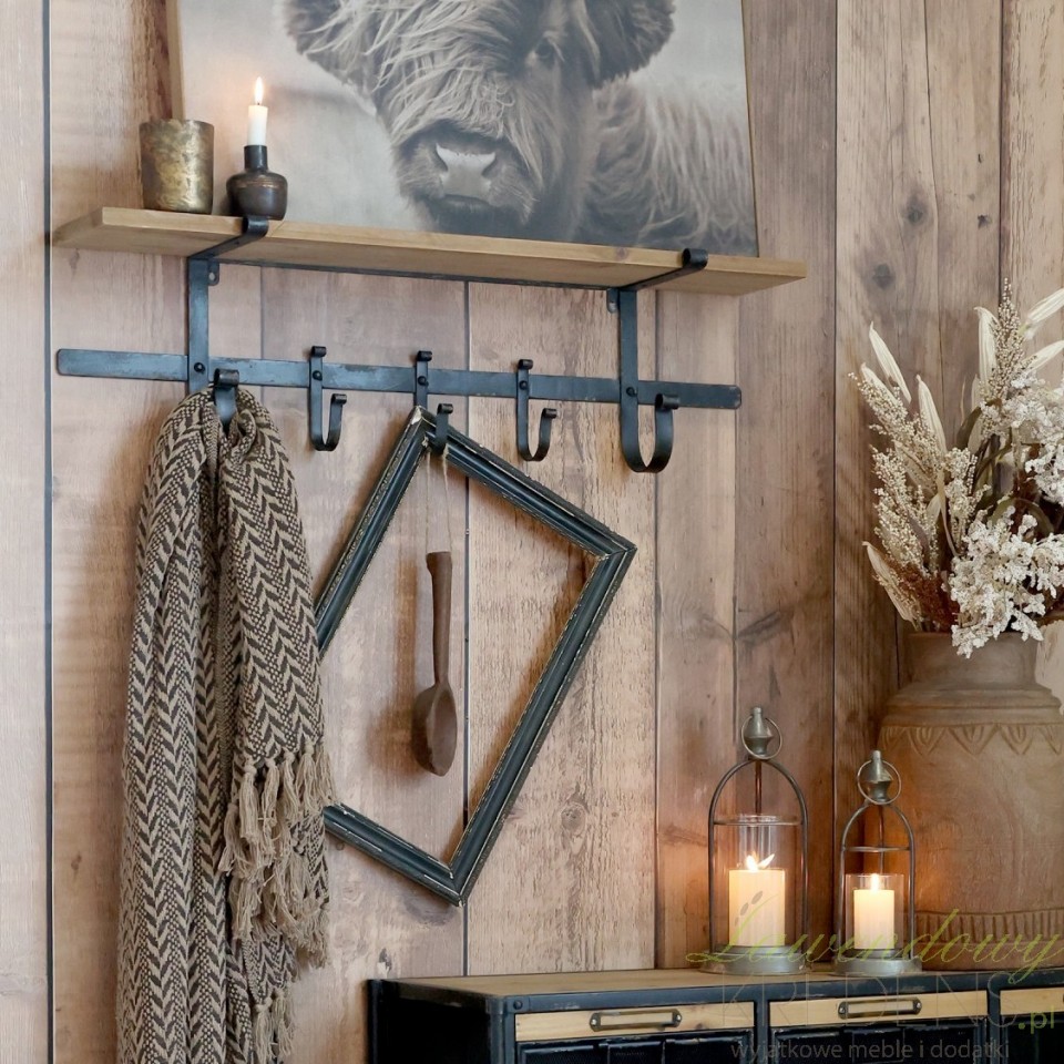 Mebel o wymiarach 25 cm wysokości, 92 cm szerokości i 18,5 cm głębokości oferuje pięć solidnych haczyków, które pomieszczą szale, torby, kapelusze czy dekoracje ścienne. Nad wieszakami znajduje się stabilna półka – idealna na świece, obrazy, doniczki lub ulubione bibeloty. Całość tworzy spójną kompozycję dekoracyjno-użytkową, która przyciąga wzrok, a jednocześnie organizuje przestrzeń.