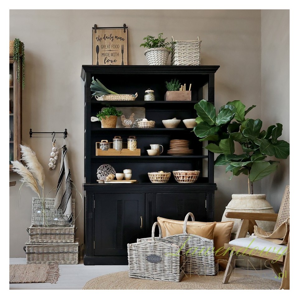 Czarna kolorystyka regału dodaje mu nowoczesnego wyrazu, a jednocześnie pięknie kontrastuje z jasnymi ścianami, naturalnym drewnem lub plecionkami, tworząc efekt wnętrzarskiej harmonii. To mebel, który wprowadza do pomieszczenia głębię, ale nie przytłacza – dzięki zgrabnym proporcjom i subtelnym zdobieniom pozostaje lekki wizualnie.