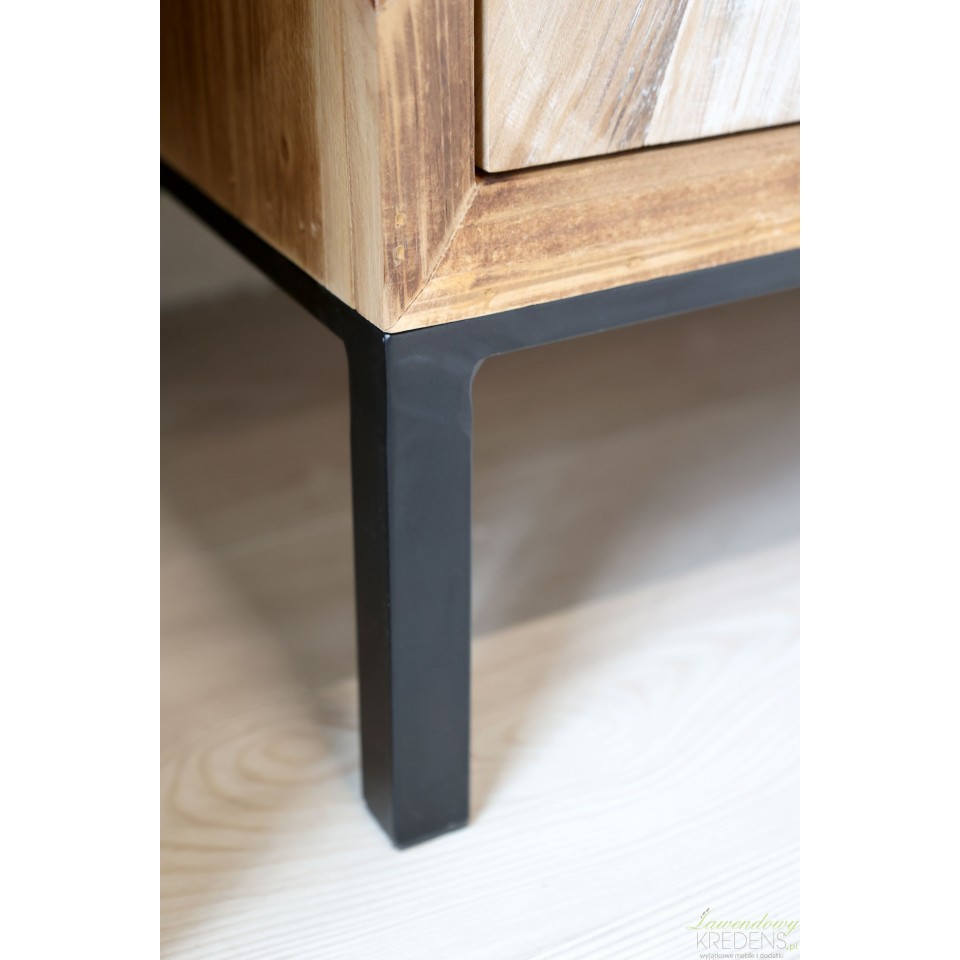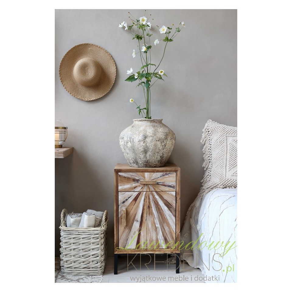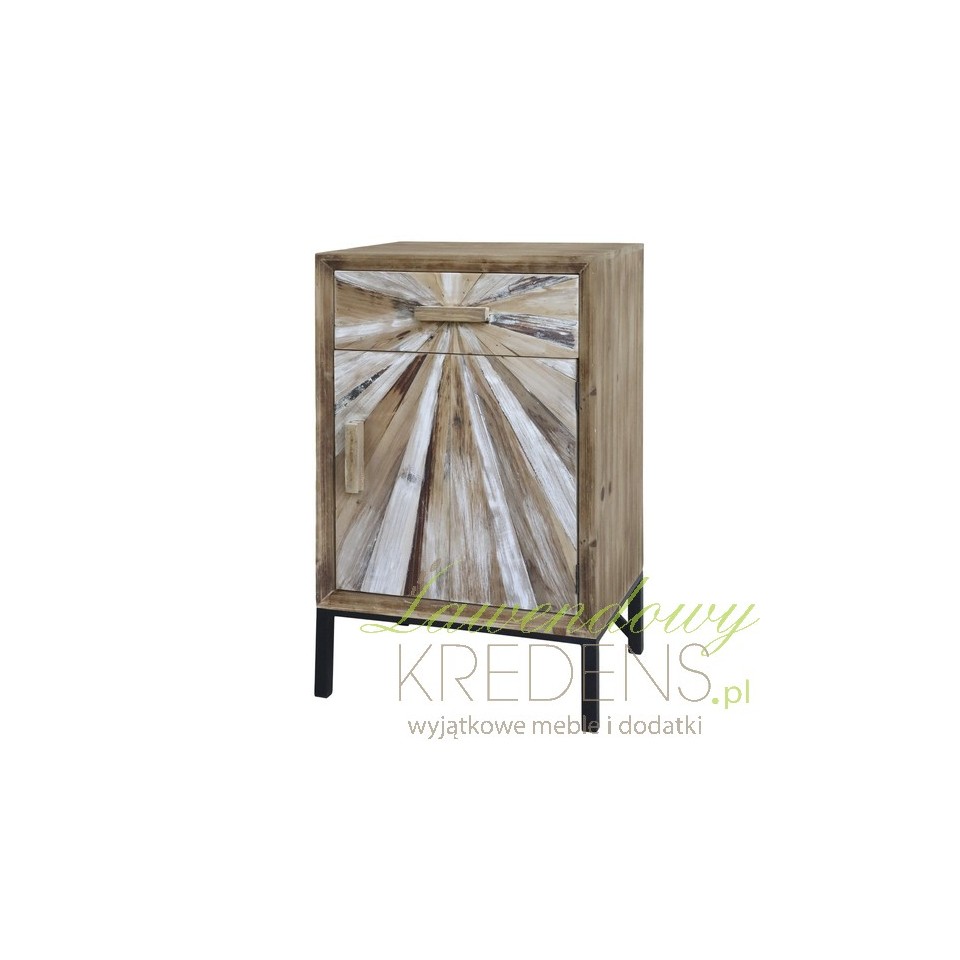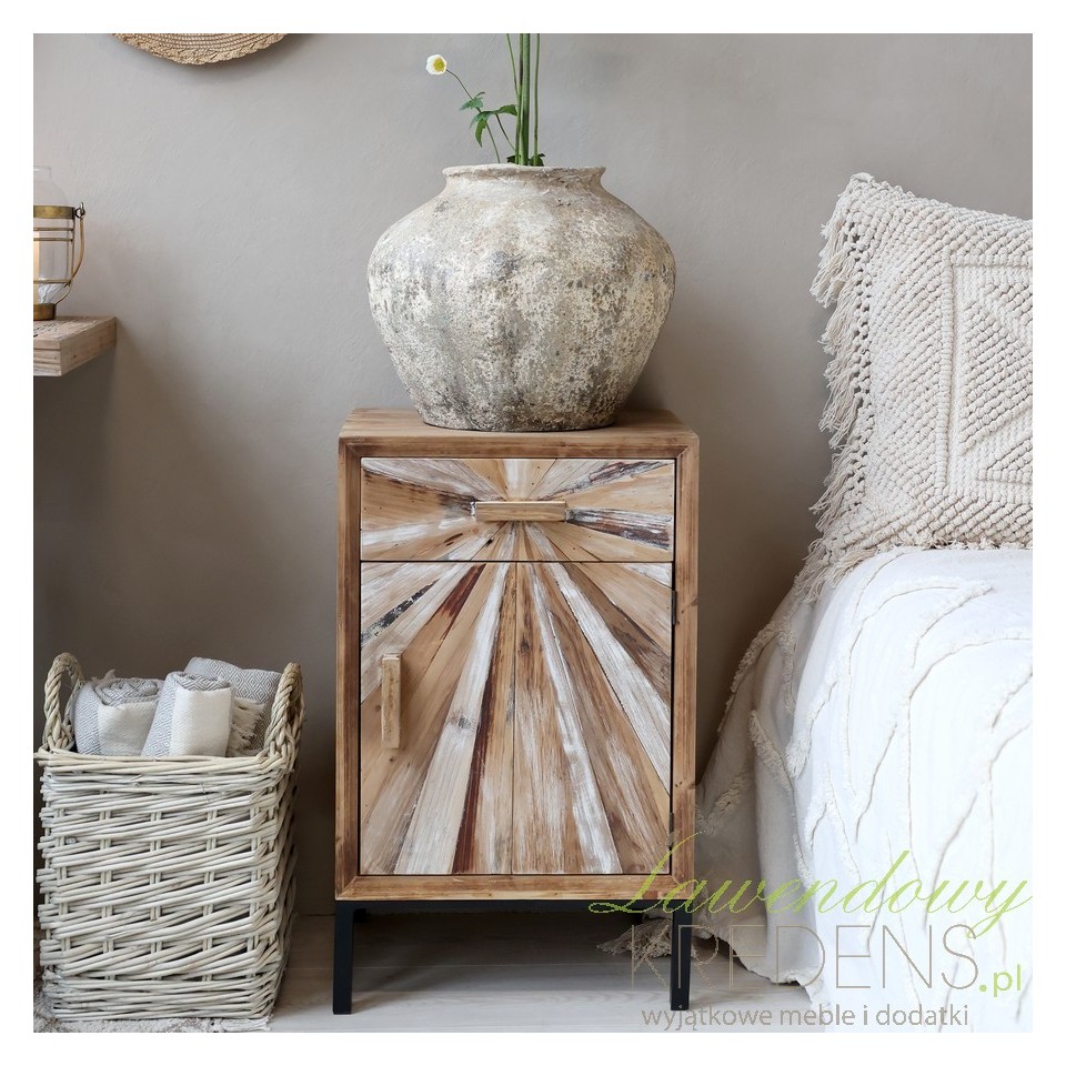 Wykonana z drewna jodłowego pochodzącego z recyklingu, ta szafka jest nie tylko funkcjonalnym meblem, ale również manifestem świadomego podejścia do designu. Każdy egzemplarz posiada unikalne usłojenie, zróżnicowaną kolorystykę i charakterystyczny front w kształcie promieni słonecznych – co sprawia, że żaden egzemplarz nie jest identyczny. Drewno uzupełnia lekka, a zarazem stabilna podstawa z metalu malowanego na czarno, nadająca meblowi loftowego charakteru.