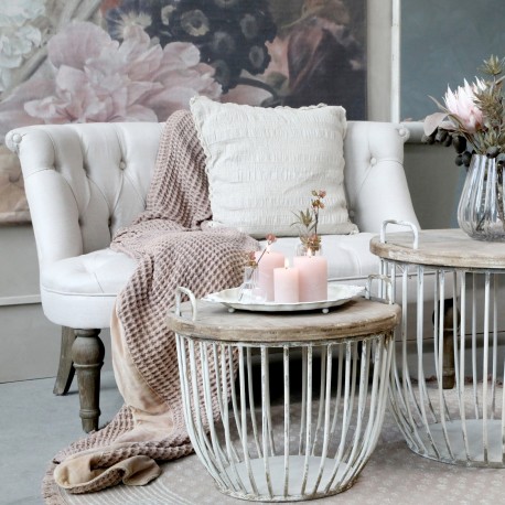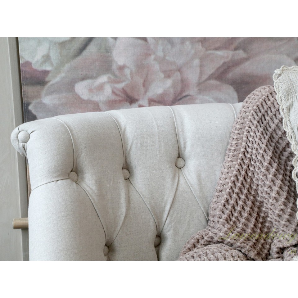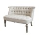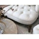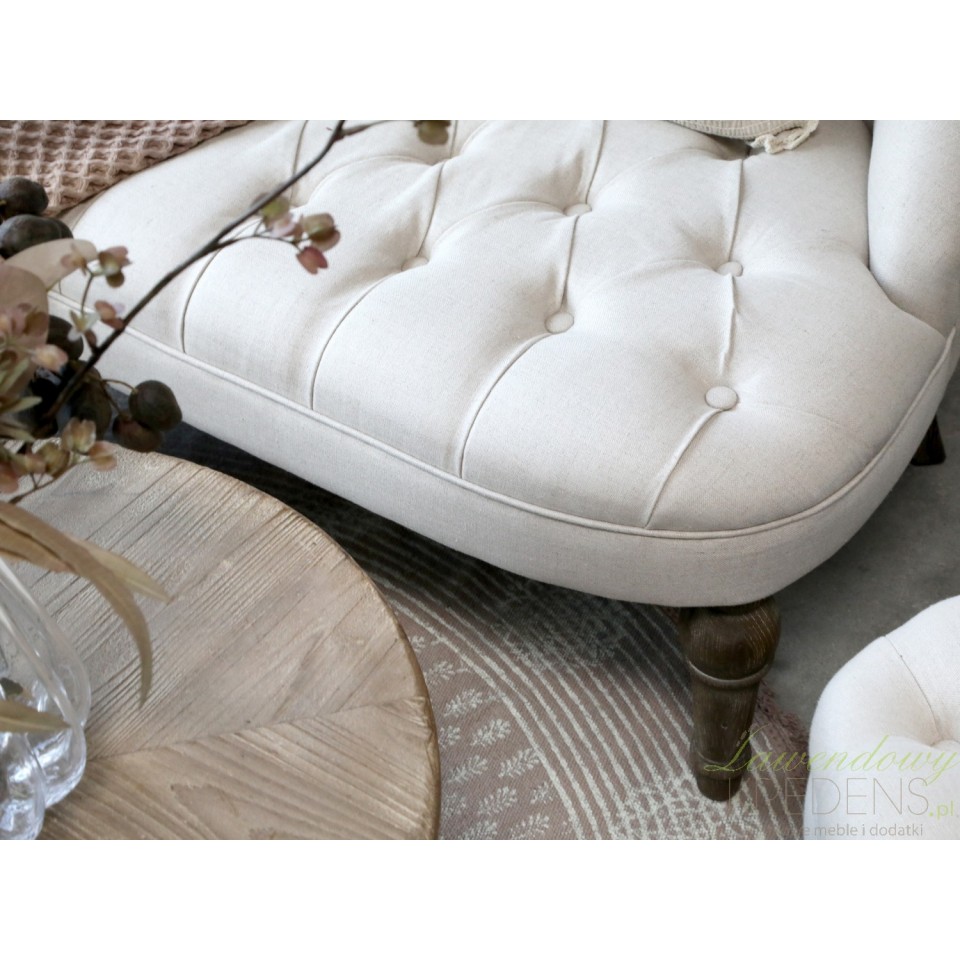 Półkoliście wyprofilowana, dwuosobowa sofa tapicerowana o wygodnym, głębokim siedzisku z ozdobnymi, wywiniętymi rogami. Jej prowansalski charakter świetnie oddają kolor powierzchni i pikowania zarówno na siedzisku jak i na wysokim oparciu. Idealna do stylowego salonu czy do przestronnej sypialni - świetna propozycja od Chic Antique!