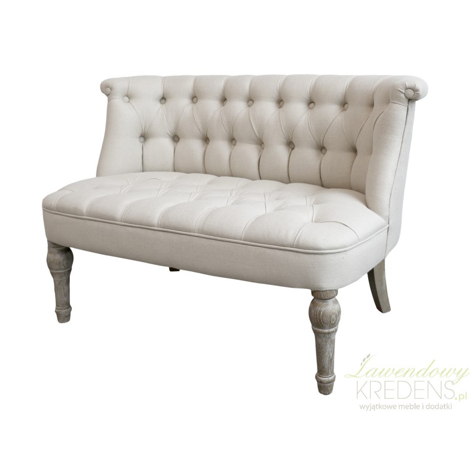 Z całą pewnością wygodna i komfortowa sofa prowansalska o tapicerowanej, beżowej powierzchni. Nie możesz jej nie mieć!