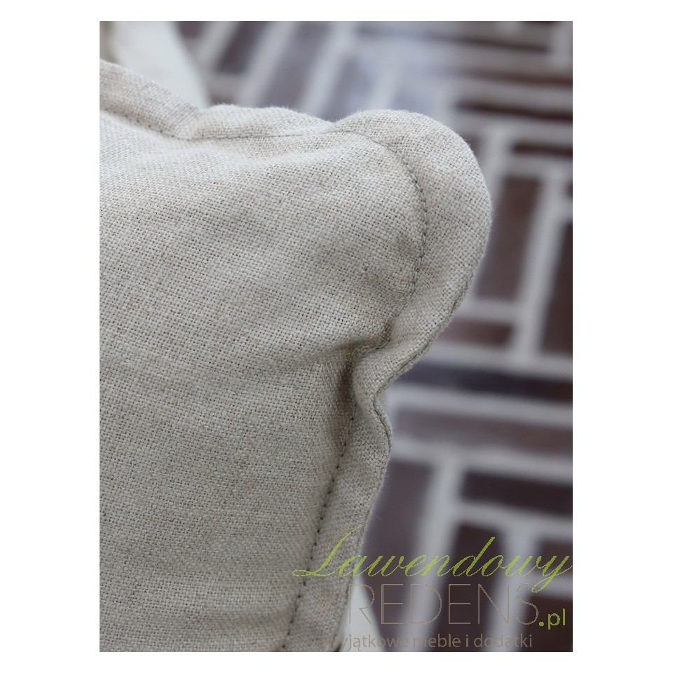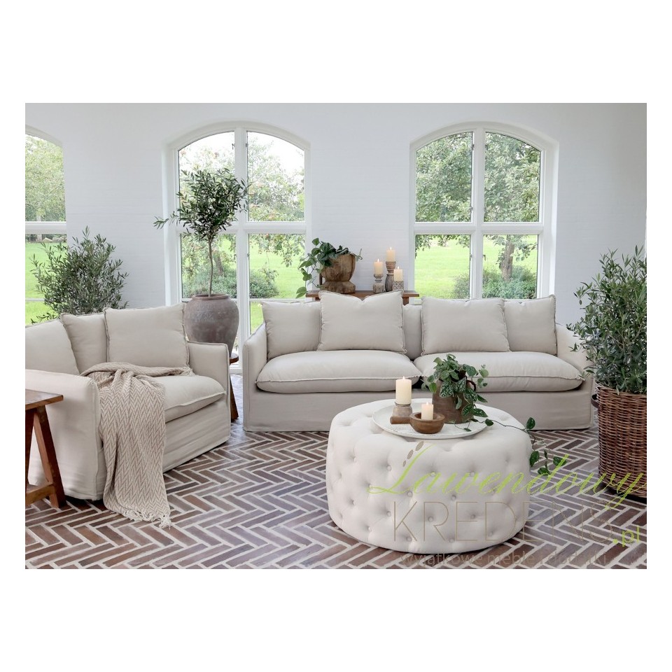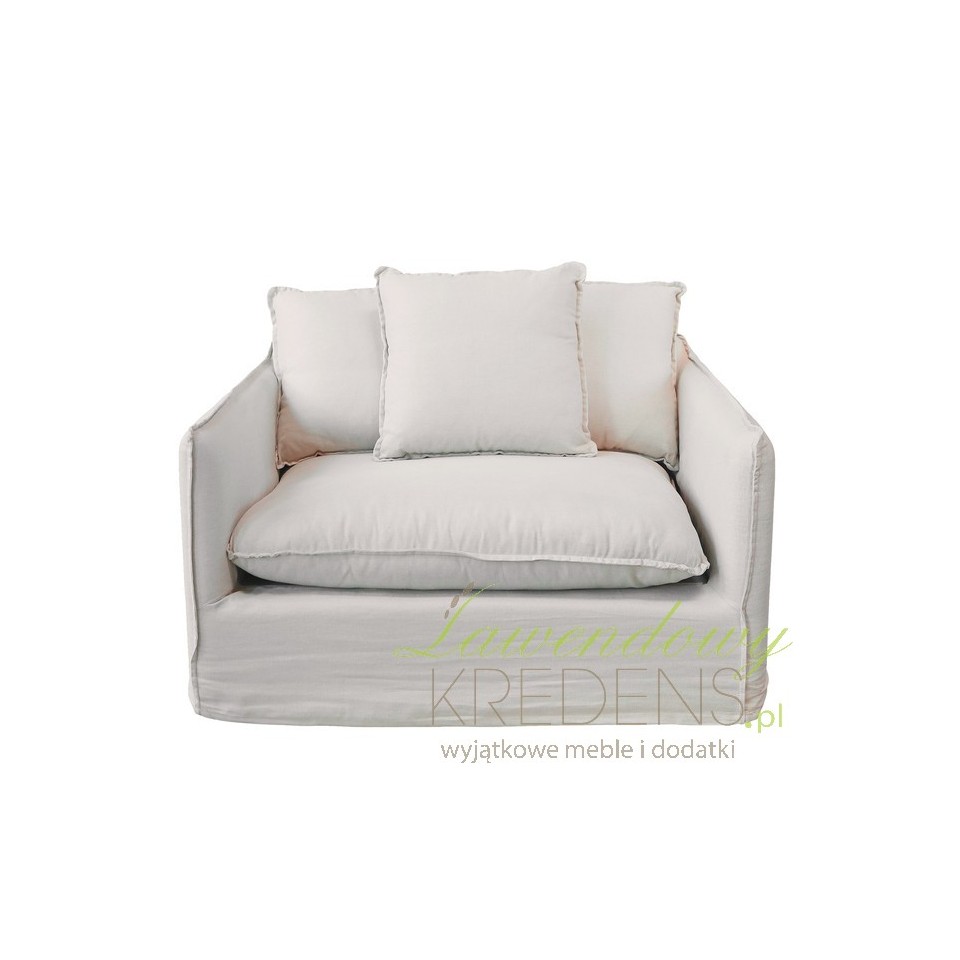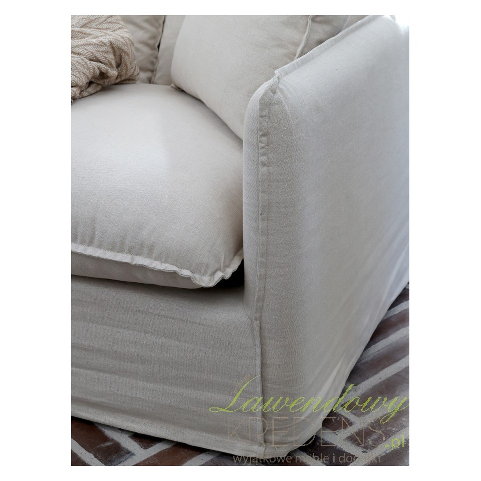 Szeroki fotel prowansalski Malo Chic Antique z trzema poduszkami to mebel łączący elegancję i wygodę. Wykonany z lnu i drewna, w beżowej tonacji, zapewnia przytulny charakter wnętrza. Doskonały do salonu w stylu prowansalskim, rustykalnym i japandi. Idealne miejsce do relaksu z książką czy filiżanką kawy.