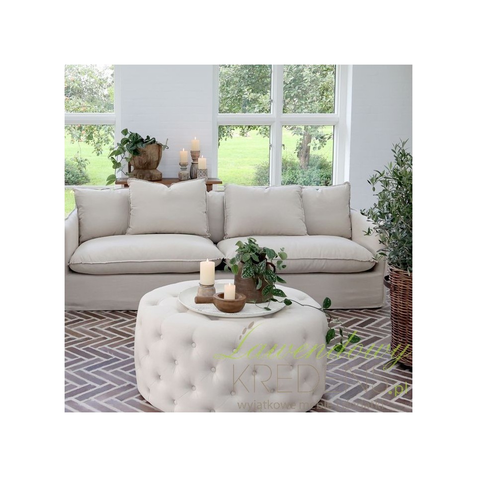 Sofa prowansalska z lnu Chic Antique Malo to mebel, który od pierwszego spojrzenia urzeka swoją subtelną formą i miękkimi liniami. Wykonana z naturalnych materiałów – drewna, lnu i sklejki – łączy w sobie trwałość oraz wyjątkową estetykę. To propozycja dla osób, które poszukują mebla nie tylko praktycznego, ale także pełnego charakteru, nadającego wnętrzu atmosferę spokoju i przytulności.