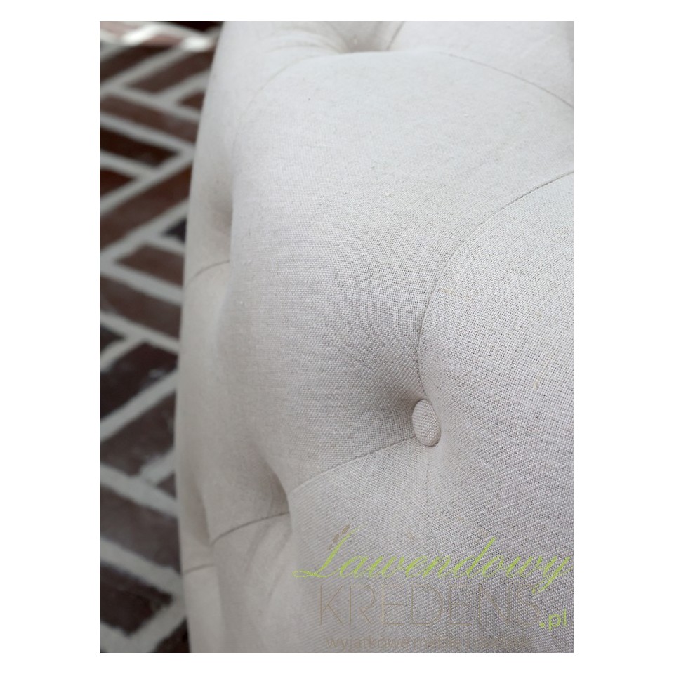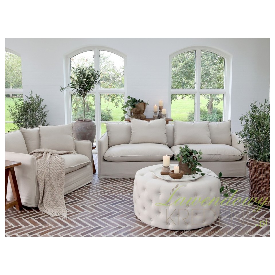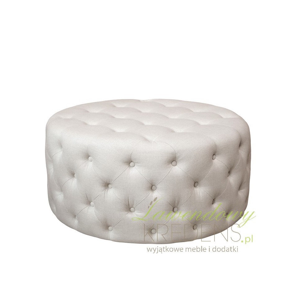 Pufa prowansalska Chic Antique Malo to elegancki, pikowany mebel tapicerowany lnem w kolorze beżowym. Idealnie sprawdzi się jako dodatkowe siedzisko, stolik kawowy lub stylowa dekoracja. Dzięki solidnej konstrukcji i subtelnemu designowi wprowadza do wnętrza przytulność oraz rustykalno-japandi harmonię.