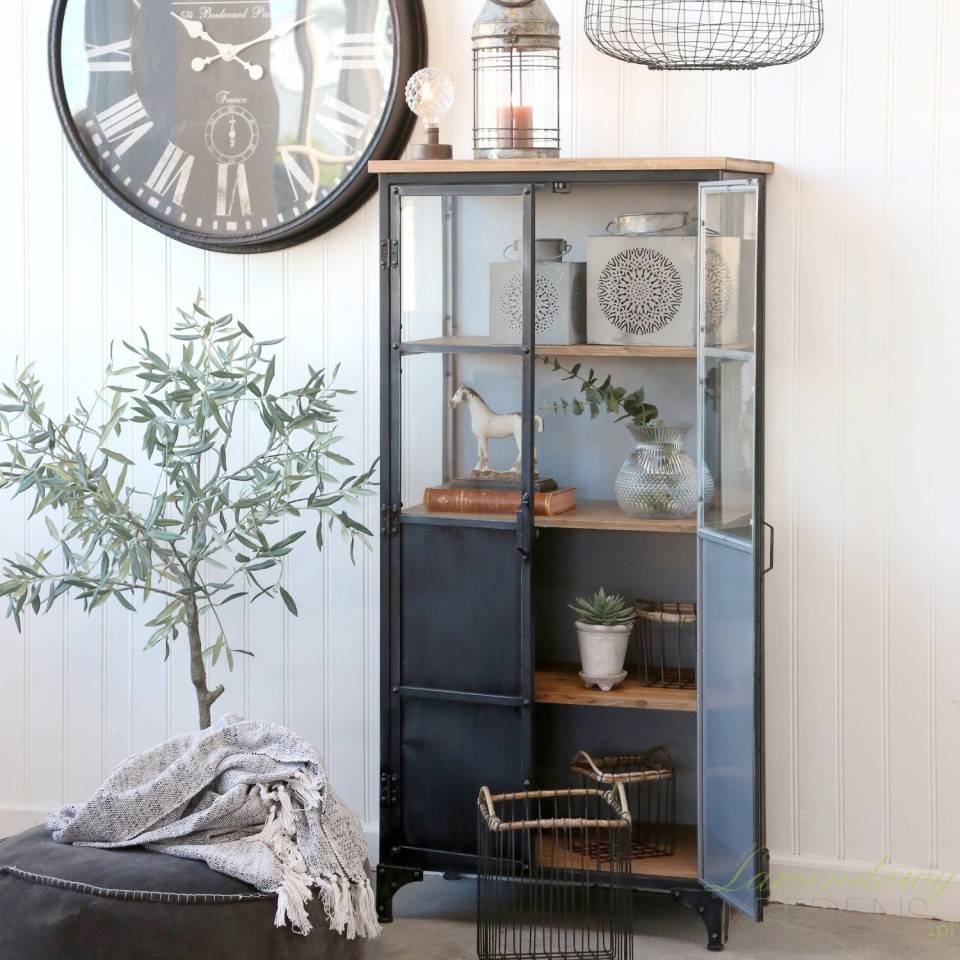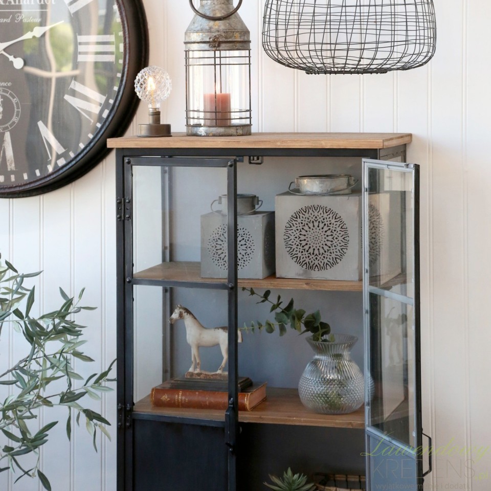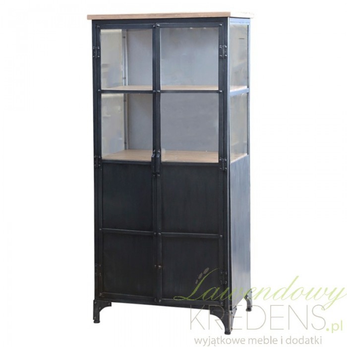 Witryna w stylu industrialnym w czarnym kolorze ma wewnątrz drewniane półki i okryta jest blatem w tym samym kolorze. Dzięki częściowo przeszklonym drzwiom może służyć zarówno ekspozycji jak i przechowywaniu przedmiotów w Twoim wnętrzu. Delikatnie postarzana witryna industrialna doskonale nadaje się do wielu aranżacji loftowych. Wybierz meble industrialne i wykorzystaj je jako biblioteczkę w gabinecie lub w salonie.