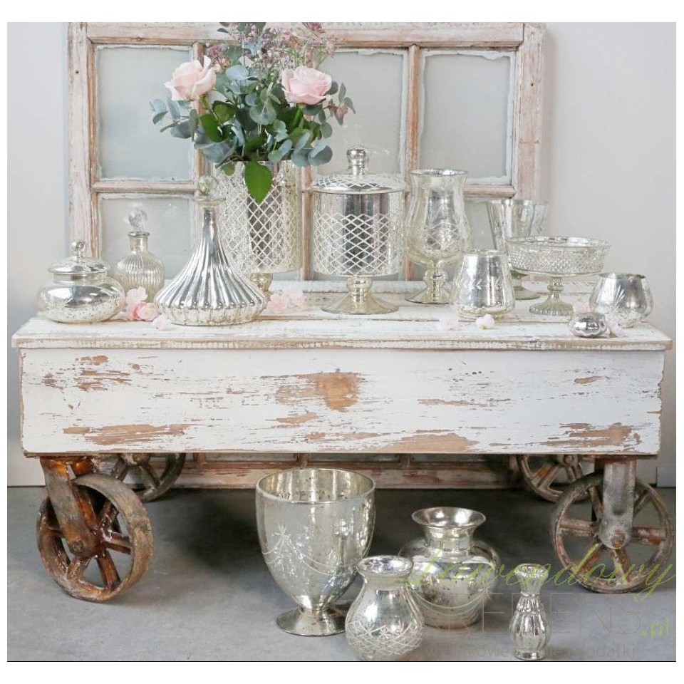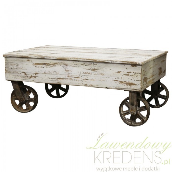 Wyglądający na bardzo stary mebel stolik Chic Antique to doskonały sposób by odmienić salonowe wnętrze. Wykorzystując go jako stolik kawowy i eksponując pośrodku salonu możesz liczyć na to, że wszyscy goście zwrócą na niego uwagę, a w szczególności na jego cztery, bardzo stare i pordzawione koła. Blat stolika jest również postarzony, co widać dzięki licznym odpryskom białej farby. Stoliki kawowe imponują swoją urodą wszystkim wielbicielom starych mebli.