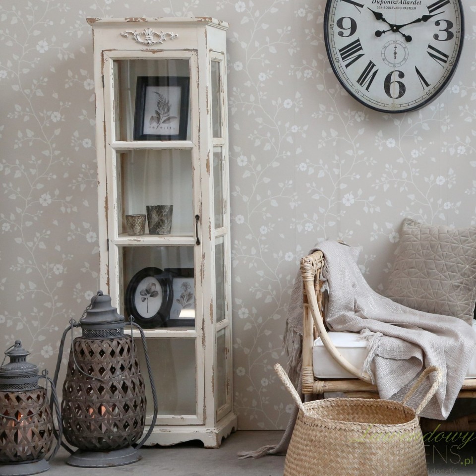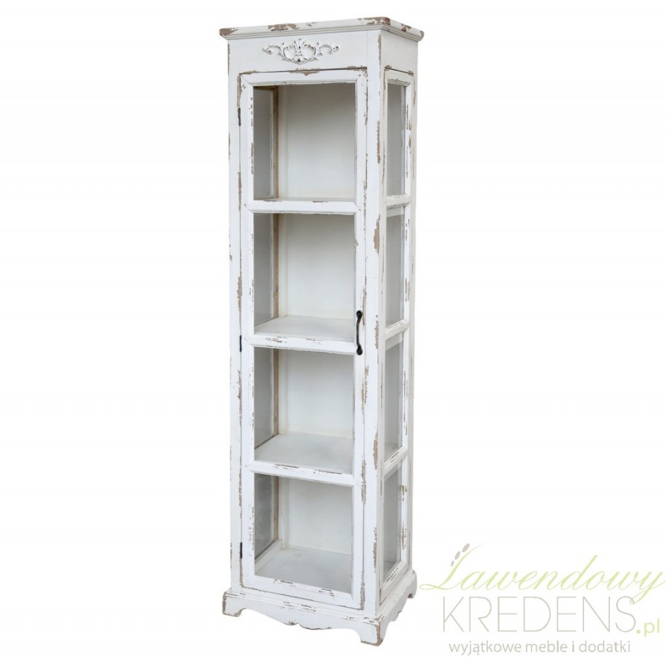 Witryna postarzana Chic Antique, jest wysoka i szykowna. Posiada pojedyncze, szklane drzwi i trzy metalowe półki.