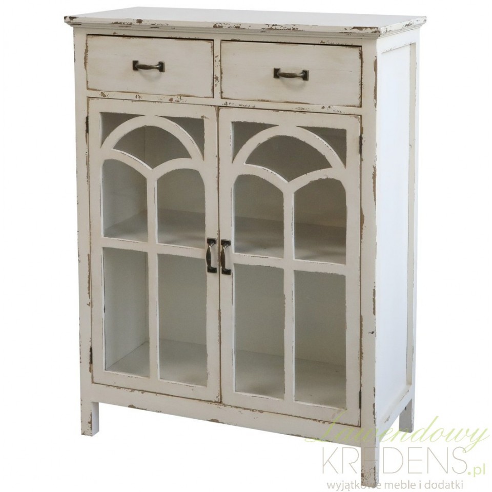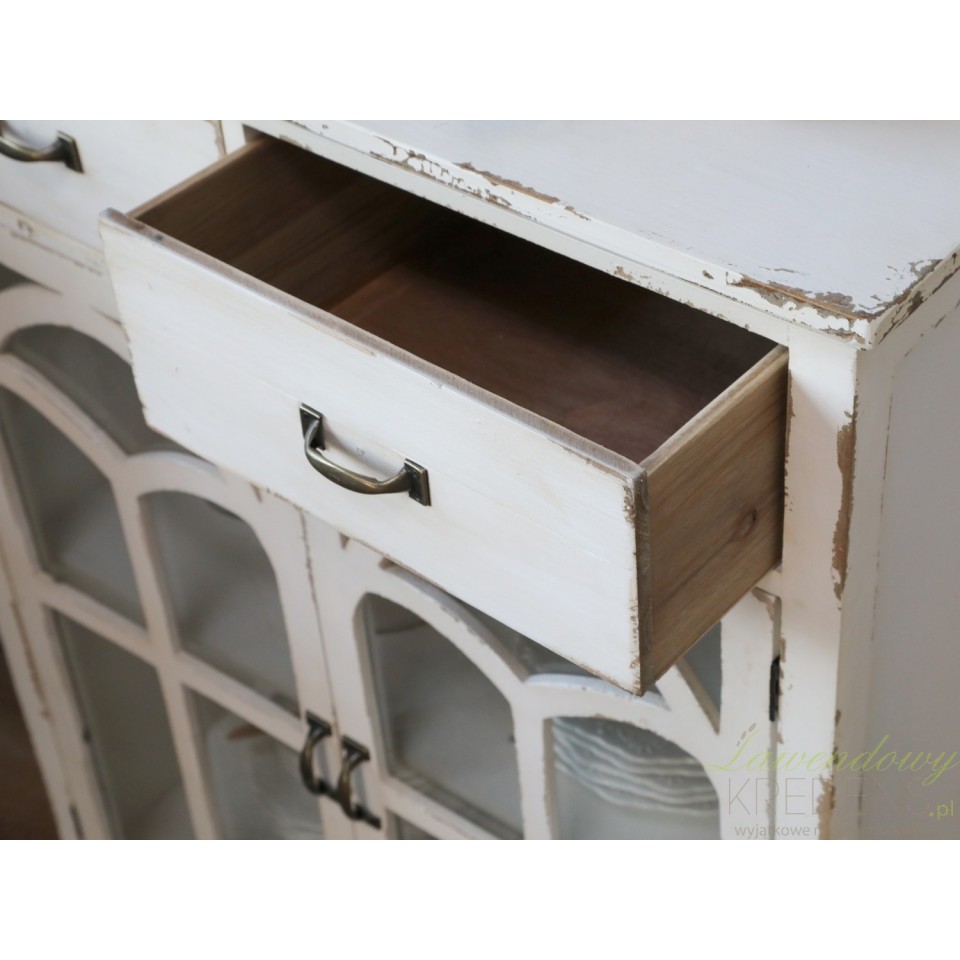 Komoda postarzana Chic Antique przeszklona używana jako mebel do przechowywania, wniesie porządek i estetykę do każdej przestrzeni.