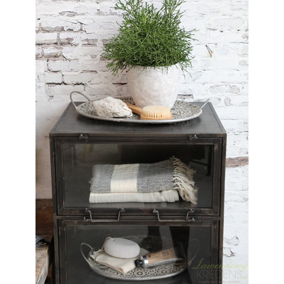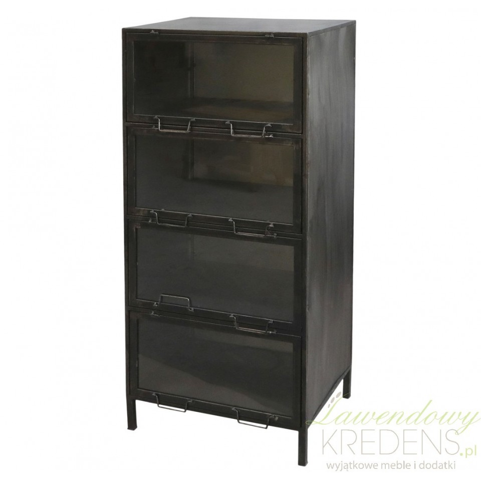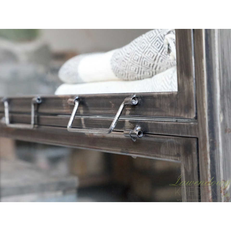 Wyposażona w cztery przeszklone półki komoda industrialna pozwoli Ci ukryć dokumenty, letnie bluzki i naczynia kuchenne. Polecamy wykorzystać ją w zestawieniu z pozostałymi meblami metalowymi od Chic Antique, aby osiągnąć spektakularny efekt. Metalowa komoda w stylu industrialnym przypomina stary mebel, za co odpowiadają jasne przebarwienia na całej powierzchni. Pamiętaj, że wygląd salonu i przedpokoju to ważna rzecz, ponieważ wnętrza te stanowią wizytówkę Twojego domu - warto wyposażyć je w meble industrialne.