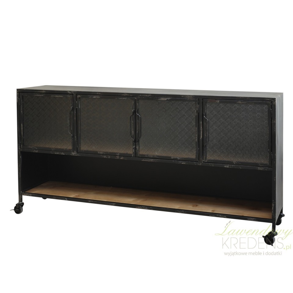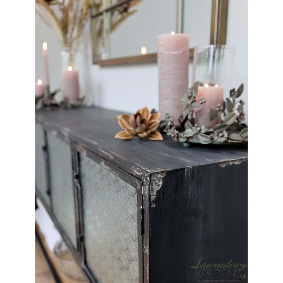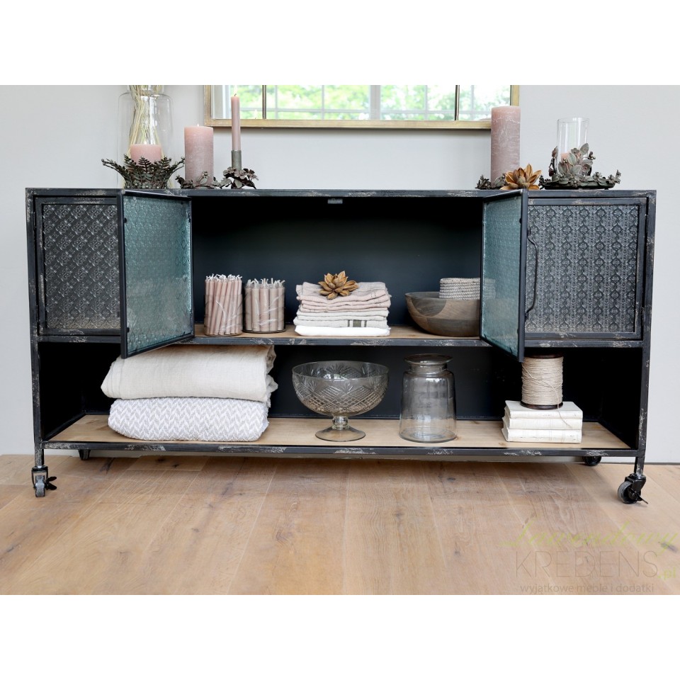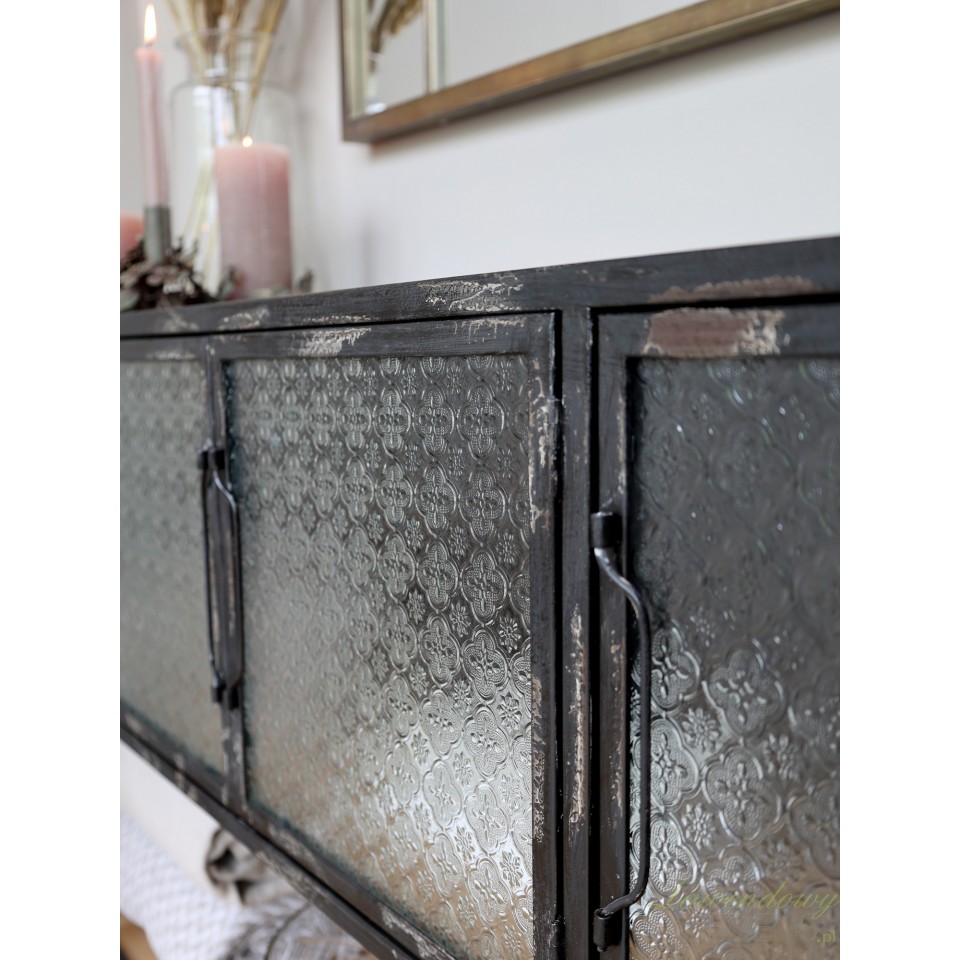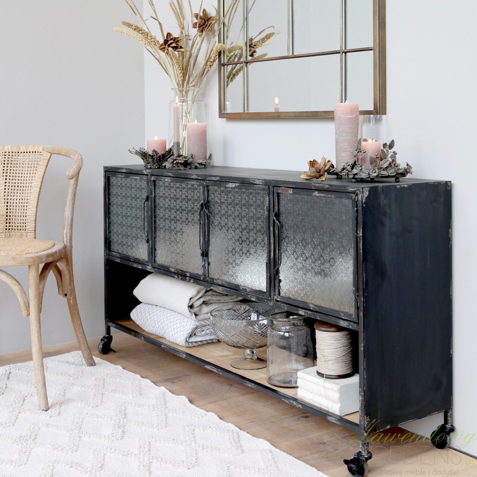 Podłużna komoda industrialna ze szkłem we wzory to jeden z mebli z antyczną duszą, o wszechstronnym zastosowaniu.