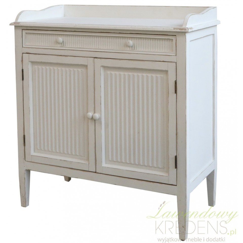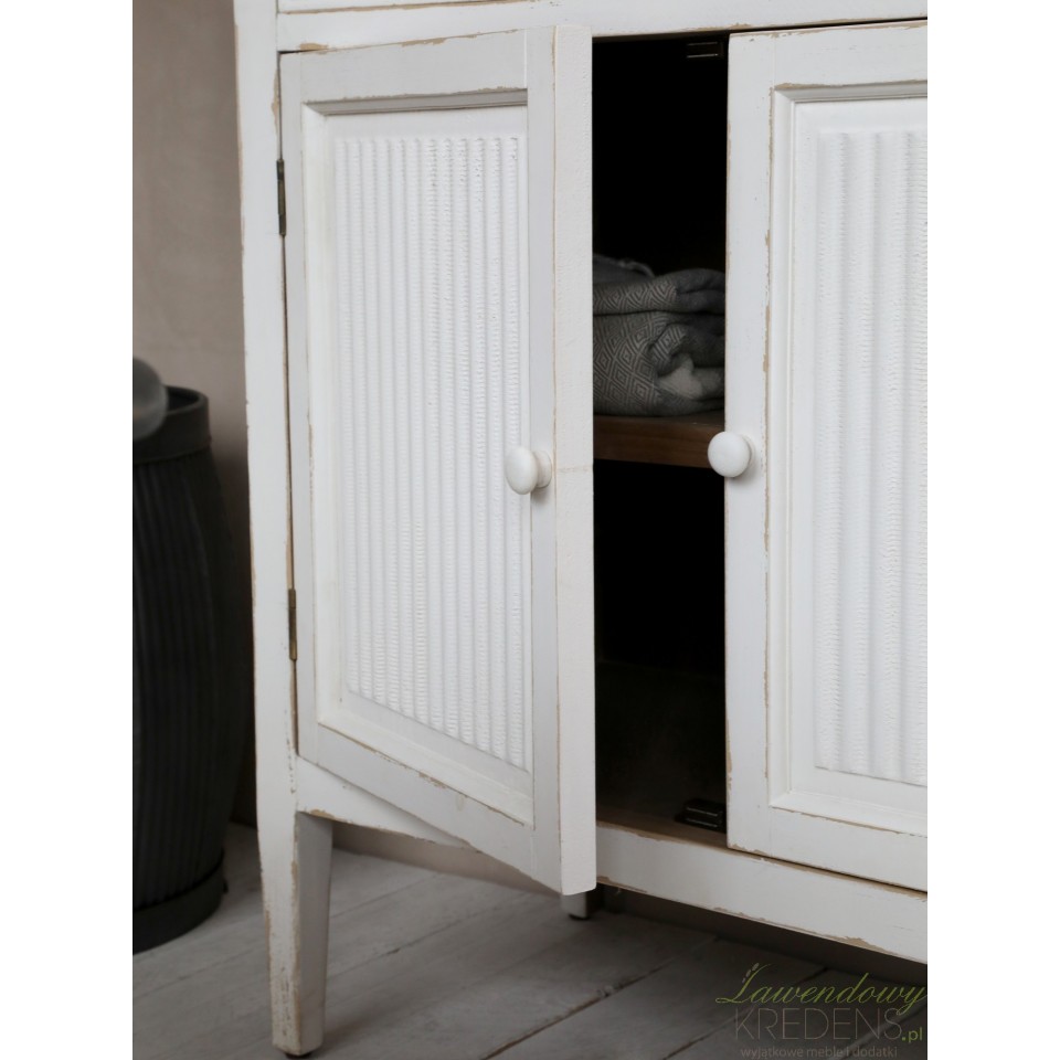 Nasza komoda prowansalska postarzana ma matową, białą powierzchnię z parą karbowanych drzwi. Zamawiając ten mebel otrzymasz satysfakcjonujące rozwiązanie do przechowywania! Komoda mierzy ponad 90 cm wysokości i 80 cm szerokości, jest solidnie wykonana, a miejscowe przetarcia widoczne w kilku miejscach jedynie dodają jej wdzięku! Zamów komody w stylu prowansalskim od Chic Antique, które doskonale nadają się do przechowywania w domu. Szuflada i kryjąca się za drzwiami półka pomieszczą przedmioty o różnych rozmiarach – wysokie butelki, dokumenty w teczkach i pudełka. Wybierz meble prowansalskie!