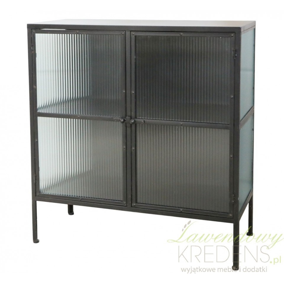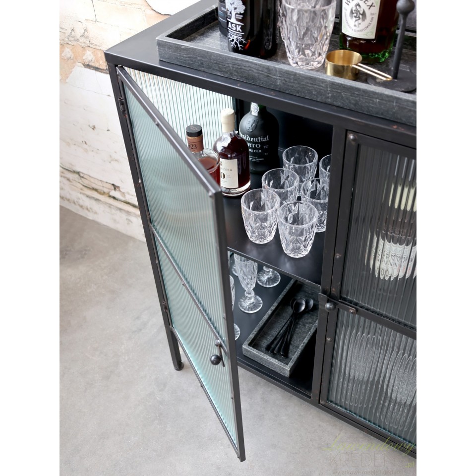 Przeszklony front oraz boki komody industrialnej Chic Antique są wyjątkowym elementem, który nadaje meblowi unikalnego wyglądu. Szkło komody zostało specjalnie ukształtowane w falowane wzory, tworząc ciekawy efekt.