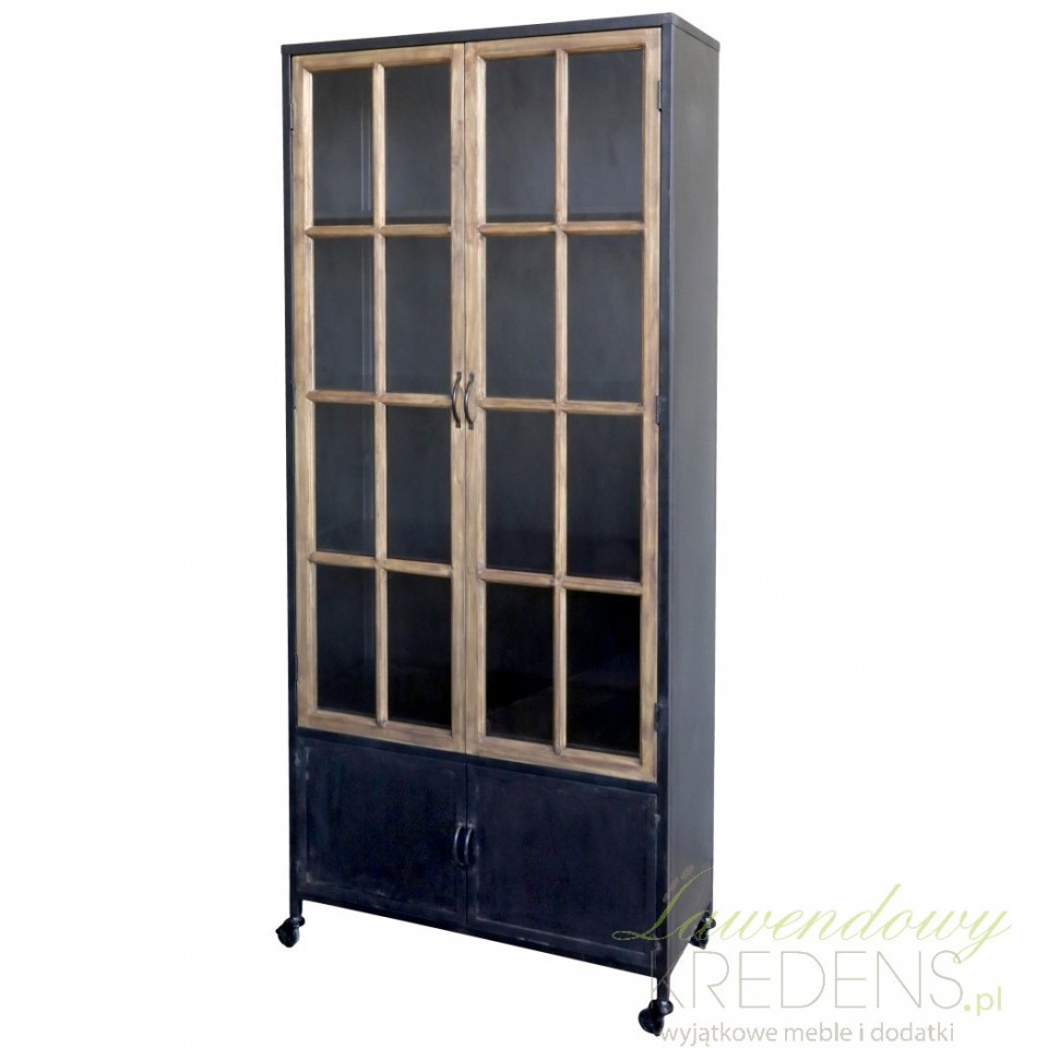 Wysoka, metalowa witryna wykonana z metalu o matowej, industrilanej powierzchni ma surowy charakter, który jest pięknie złagodzony poprzez szklane drzwi z drewnianymi szprosami o ciepłym, naturalnym odcieniu drewna. Dodają one elegancji i lekkości temu pięknemu meblowi.