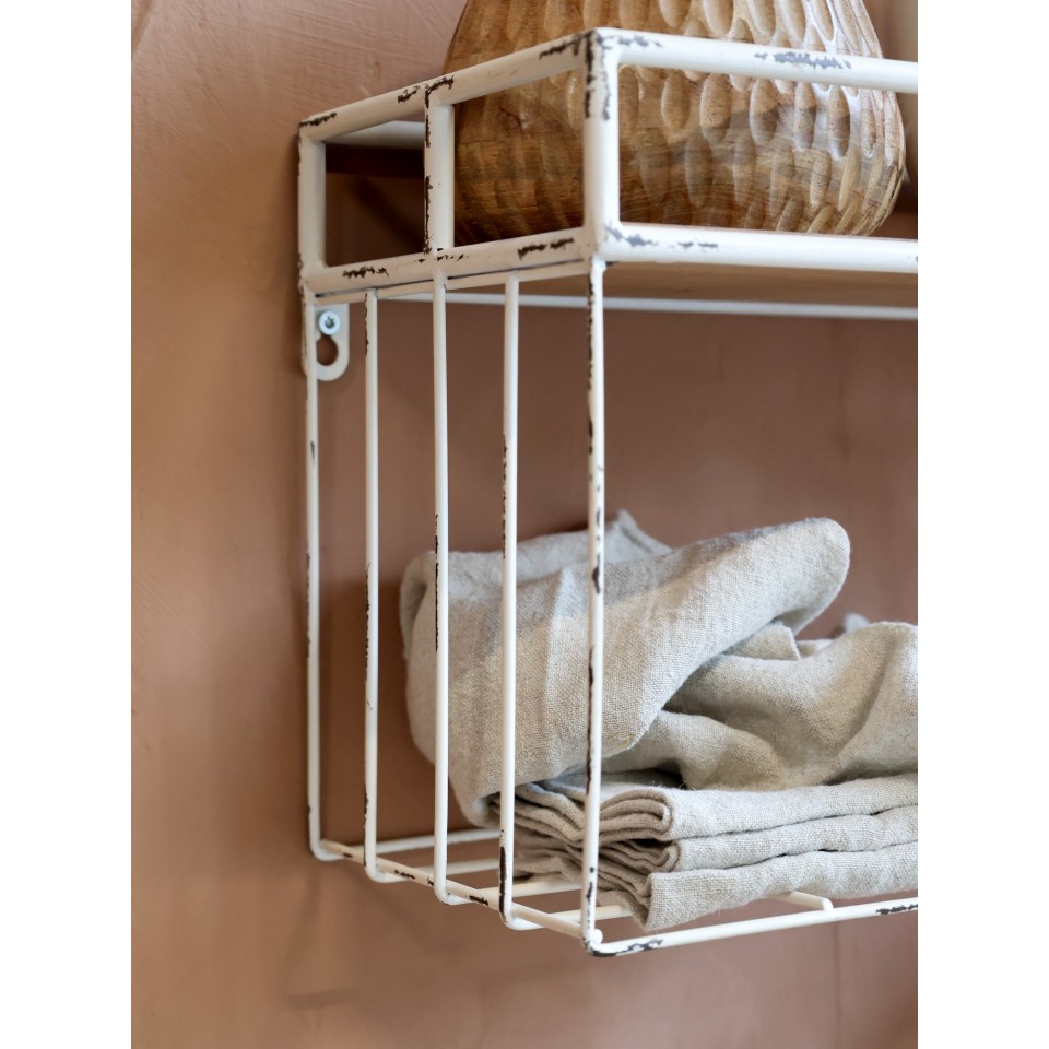 Półka ścienna vintage z koszem i wieszakami Chic Antique B to wyjątkowy mebel, który łączy w sobie funkcjonalność i niepowtarzalny styl retro. Wykonana z metalu w przecieranym wykończeniu i uzupełniona drewnianą półką, idealnie oddaje charakter mebli vintage, które są jednocześnie praktyczne i dekoracyjne.