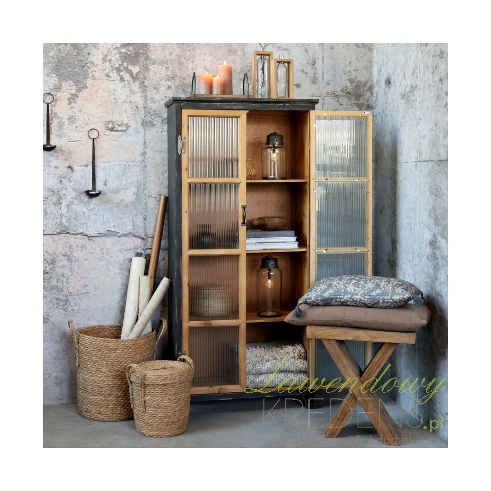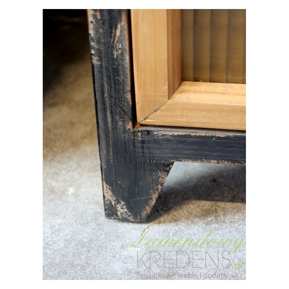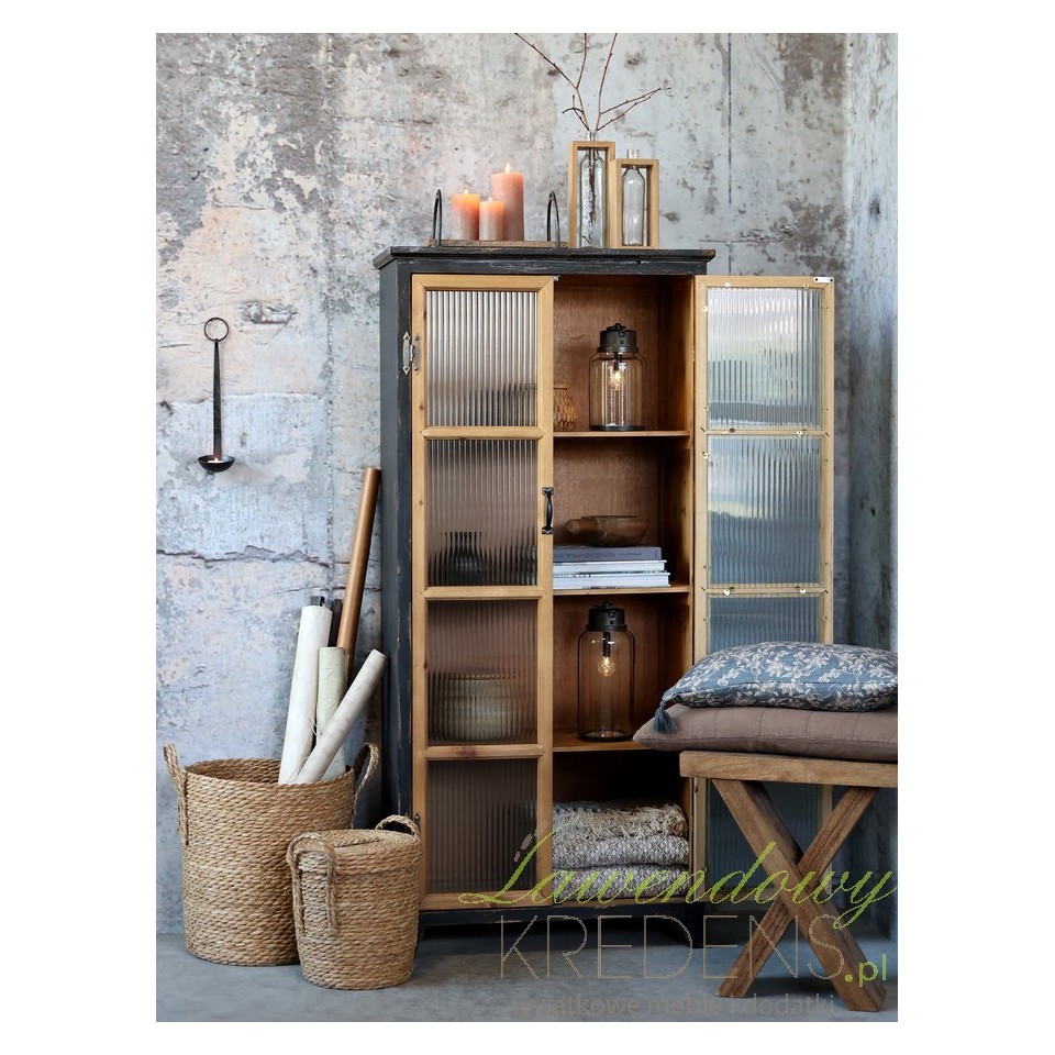 Każdy element tej witryny został zaprojektowany z myślą o pięknie i funkcjonalności. Ryflowane szkło delikatnie rozprasza światło, eksponując zawartość w subtelny sposób. Metalowy uchwyt dodaje nuty industrialnego stylu, a celowo postarzone drewno podkreśla rustykalny charakter.