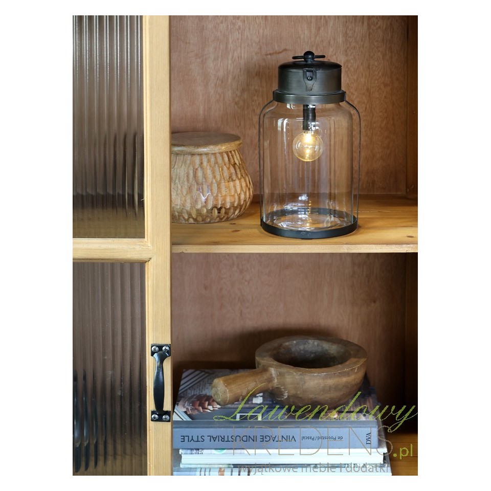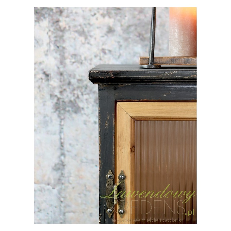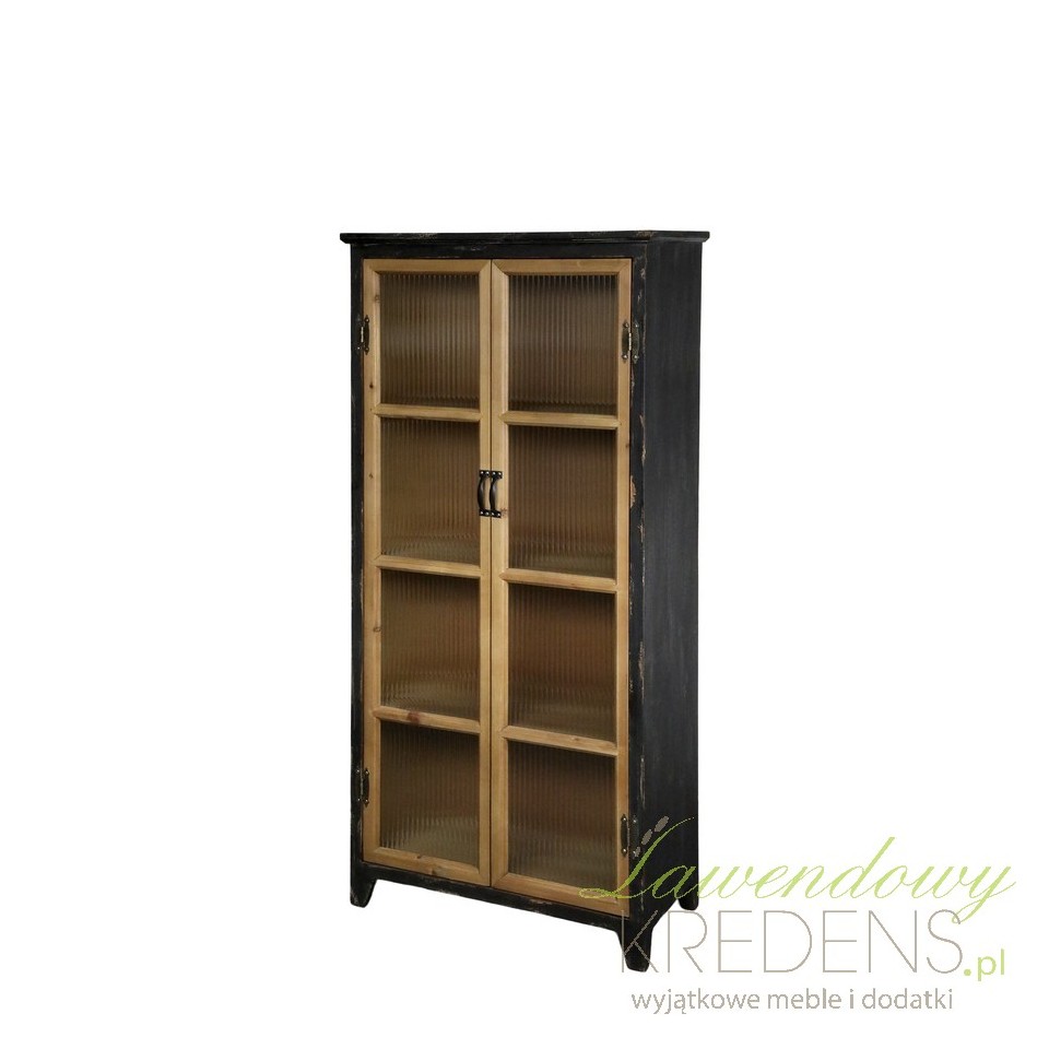 Witryna Vintage Chic Antique A to stylowy mebel z drewna jodły, metalu i szkła, który łączy rustykalny urok z industrialnym charakterem. Czarno-brązowa forma z przeszklonymi drzwiami i delikatnym postarzeniem tworzy wyjątkowy klimat vintage. Idealna do ekspozycji dekoracji, naczyń lub książek w salonie i jadalni.