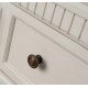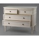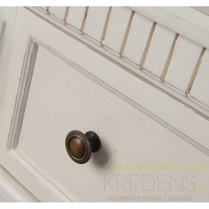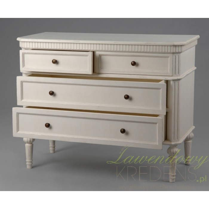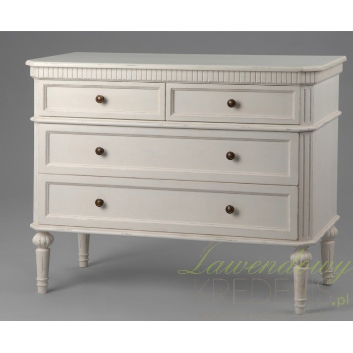 Elegancka komoda prowansalska o jasnej, kremowej barwie wyposażona w cztery szufladki w rożnych rozmiarach.