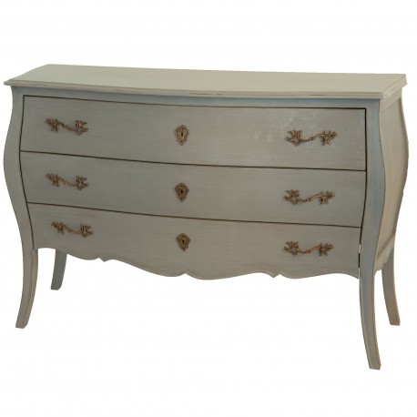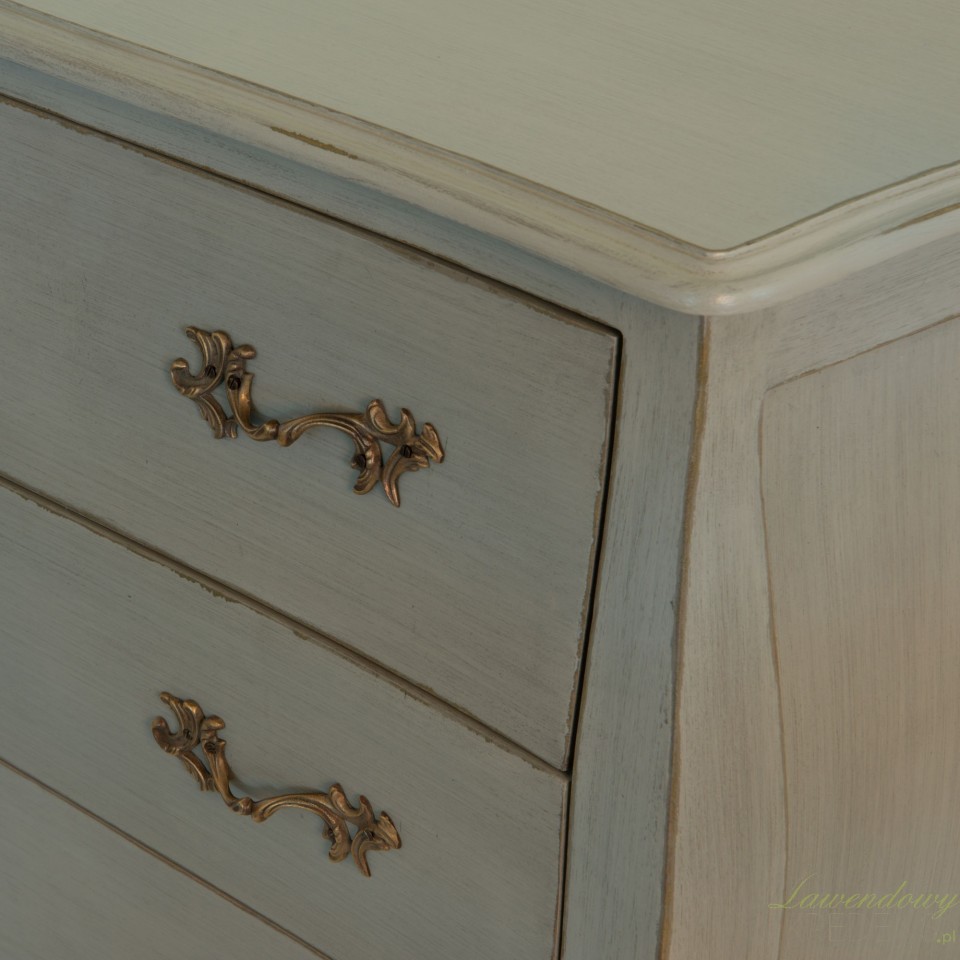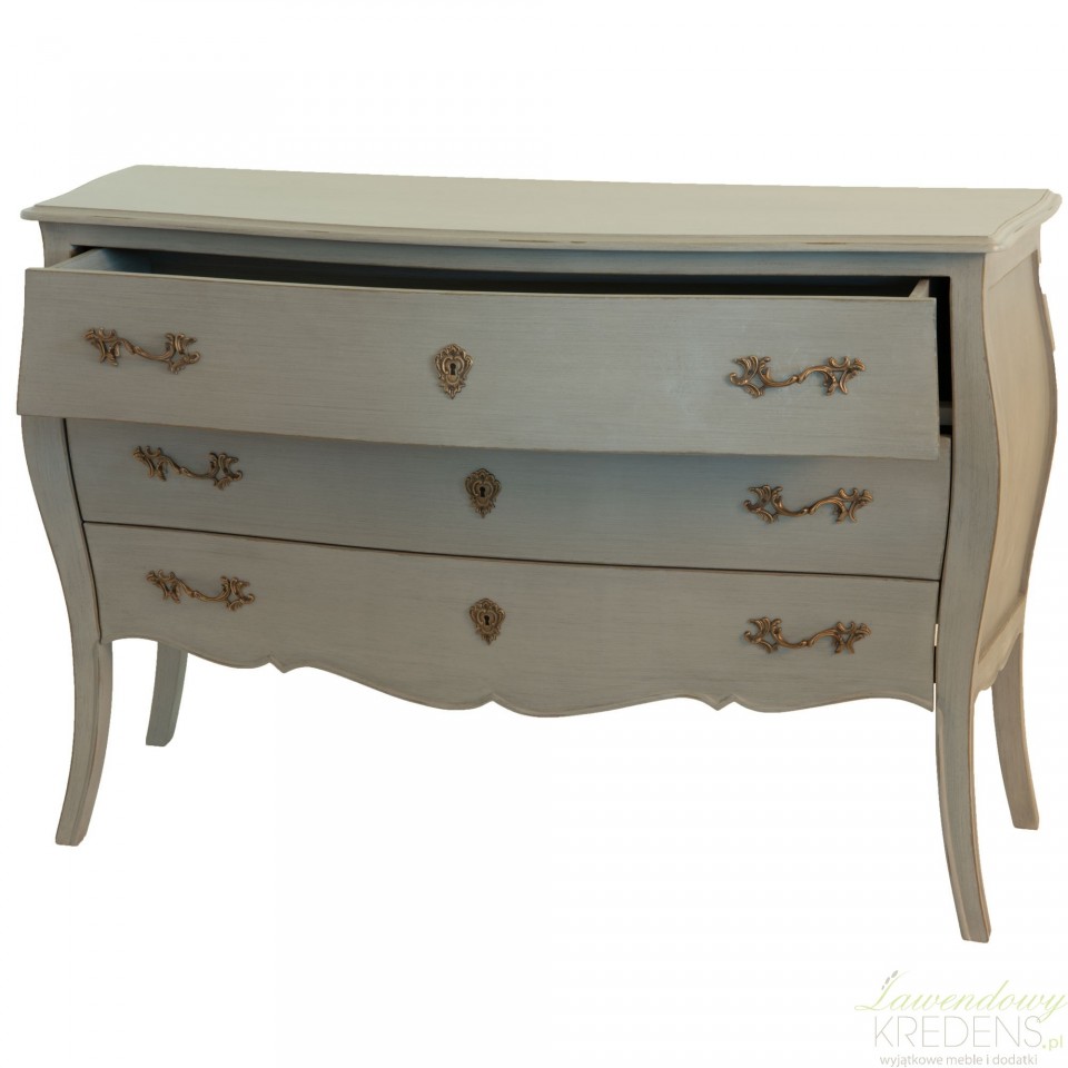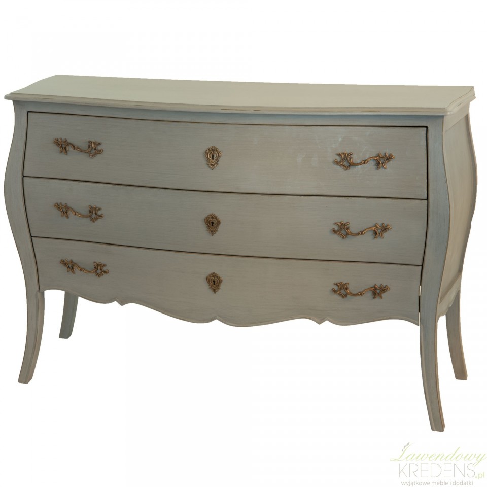 Trzy-szufladowa komoda prowansalska Murani to doskonały mebel, który z łatwością dopasuje się do wszystkich stylów wystroju wnętrz, w których króluje tradycja, klasa i elegancja. Ten model uwodzi zarówno stylowymi ozdobnikami metalowymi zamocowanymi na szufladkach, jak i opływowymi liniami, które nadają mu przytulności. Ciemnoszara komoda ma mnóstwo zalet, które docenią wielbiciele francuskich mebli. Meble prowansalskie z kolekcji Murani to gwarancja solidności i pewny urok!