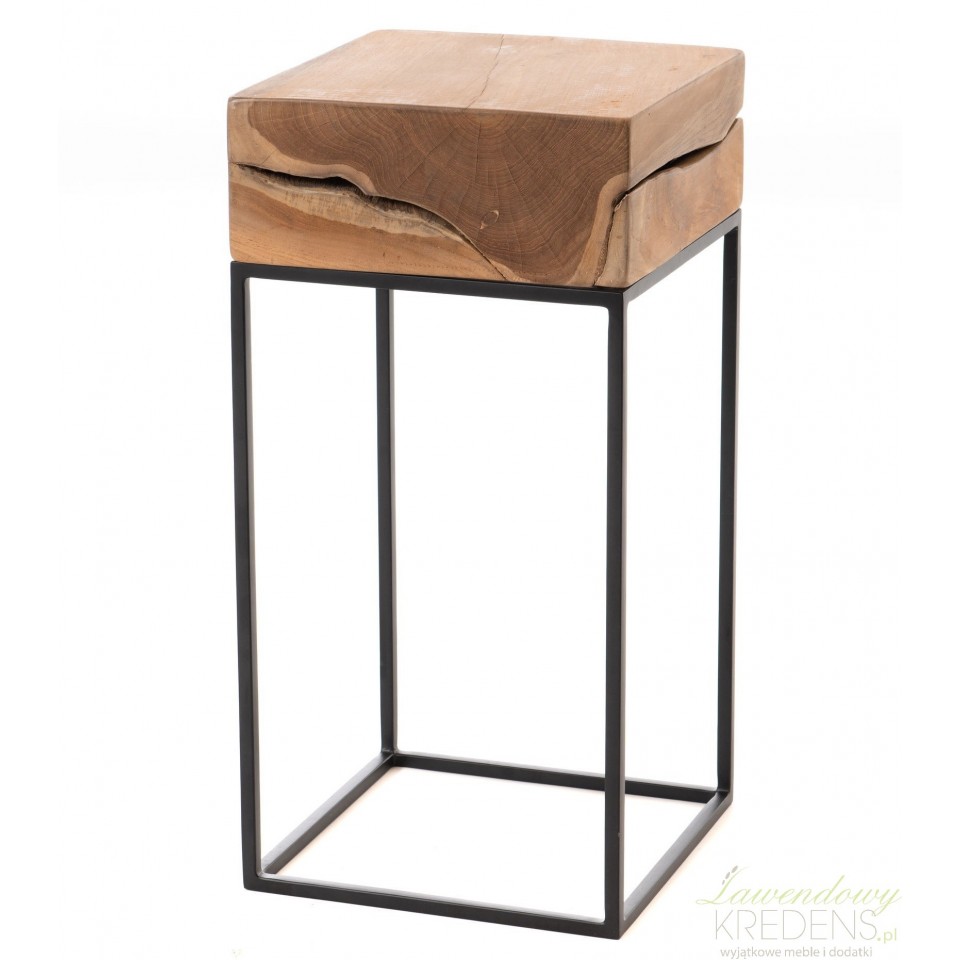 Drewno tekowe, z którego został skonstruowany stolik loft z rustykalnym blatem Ottavia ma ciepły, brązowy kolor, a widoczne na jego powierzchni spękania i słoje podkreślają jego naturalność.