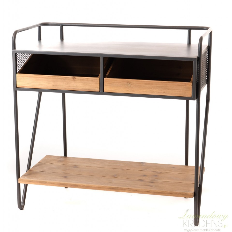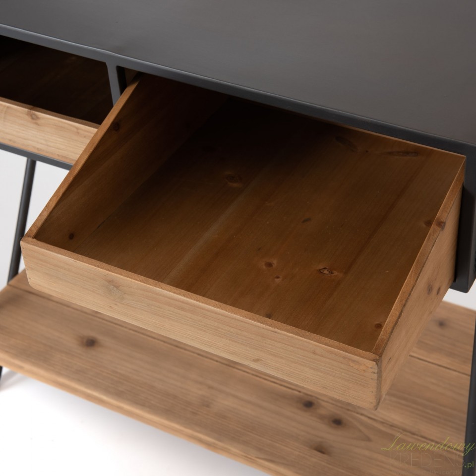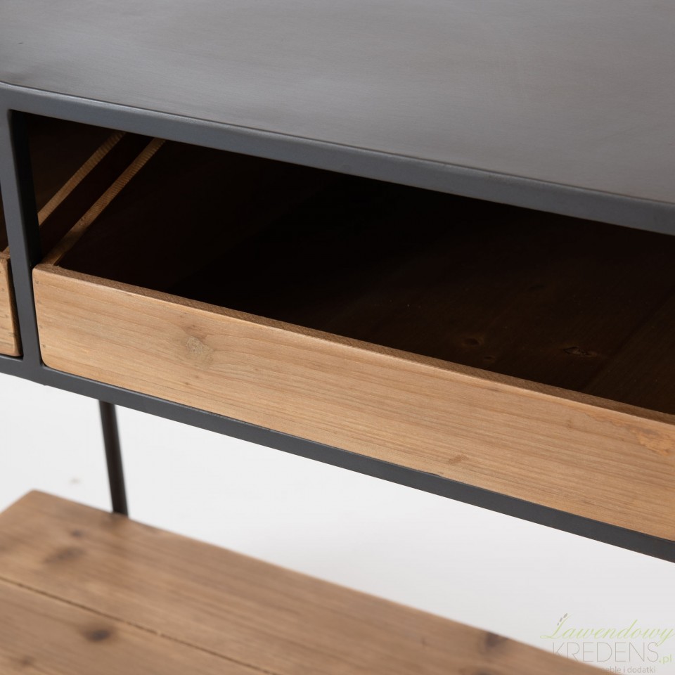 Konsola industrialna Eliz wykonana w kolorze brązowym i czarnym, posiada dwie szuflady i dwa blaty. Przydatną konsolę drewniano-metalową można umiejscowić w salonie, w sypialni lub tuż przy drzwiach wejściowych. Użyj ją do przechowywania ulubionych czasopism, w szufladach schowaj mało estetyczne bibeloty, a na dolnej półce ustaw ozdobne pudełka. Długi blat to z kolei doskonałe miejsce na ozdoby, na przykład tacę ze świecami i lampion. Meble w stylu industrialnym od francuskiej marki, dzięki niezwykle schludnemu wyglądowi przekształcą zwykły dom w uroczą przestrzeń życiową!