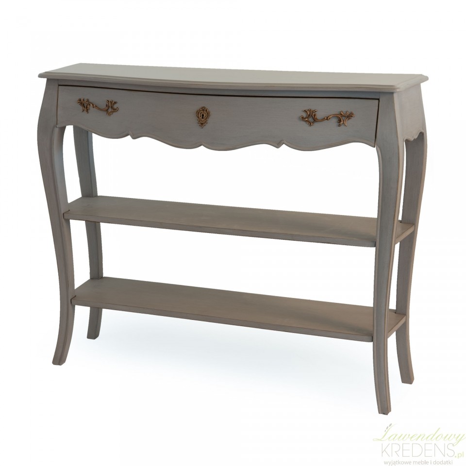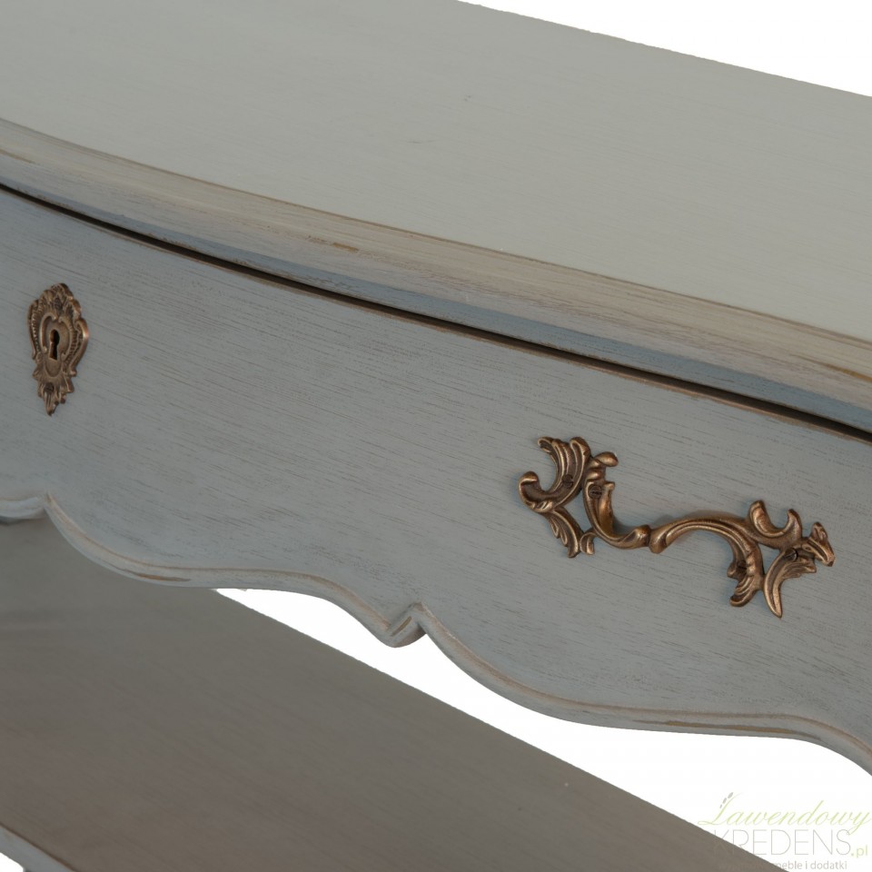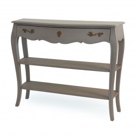 Konsola prowansalska szara Murani z półkami jest bardzo przydatna do przechowywania biżuterii, kosmetyków i innych niezbędnych rzeczy. Oferuje dużą powierzchnię roboczą.