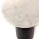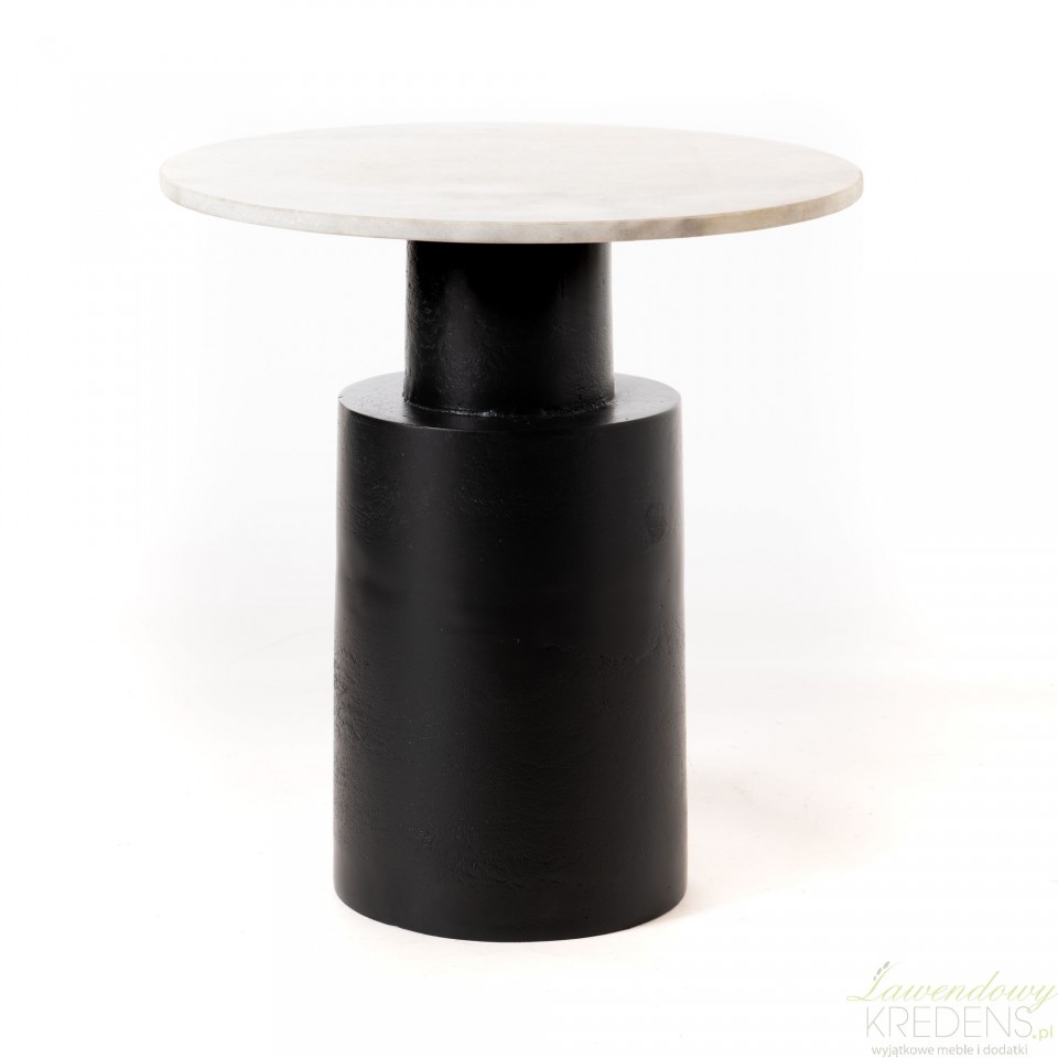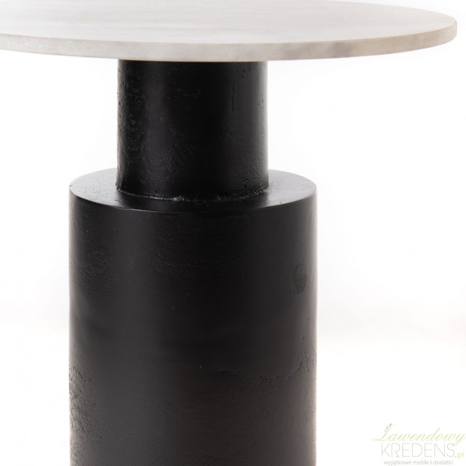 Stoły z dodatkiem marmuru to jedne z ponadczasowo pięknych mebli, które nigdy nie wyjdą z mody. Prezentowany stolik posiada blat o średnicy 50 centymetrów, który wykonany jest z marmuru w kolorze kremowej bieli. Został osadzony na czarnej, grubej nodze metalowej, która zapewnia mu bardzo dobrą stabilność i jest idealnym uzupełnieniem jasnego blatu. Ten stolik z marmurowym blatem do jadalni to coś więcej niż miejsce do siedzenia przy posiłku. Dzięki meblom z marmurem Twój dom zyska luksusowy akcent.