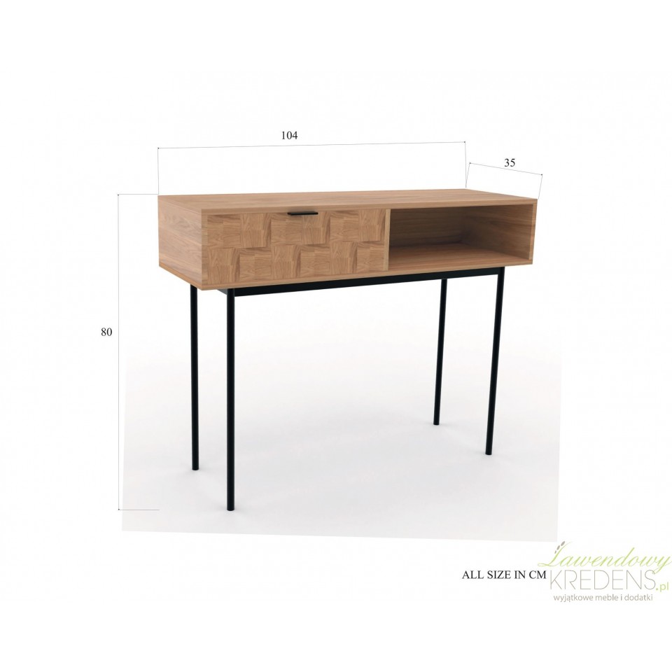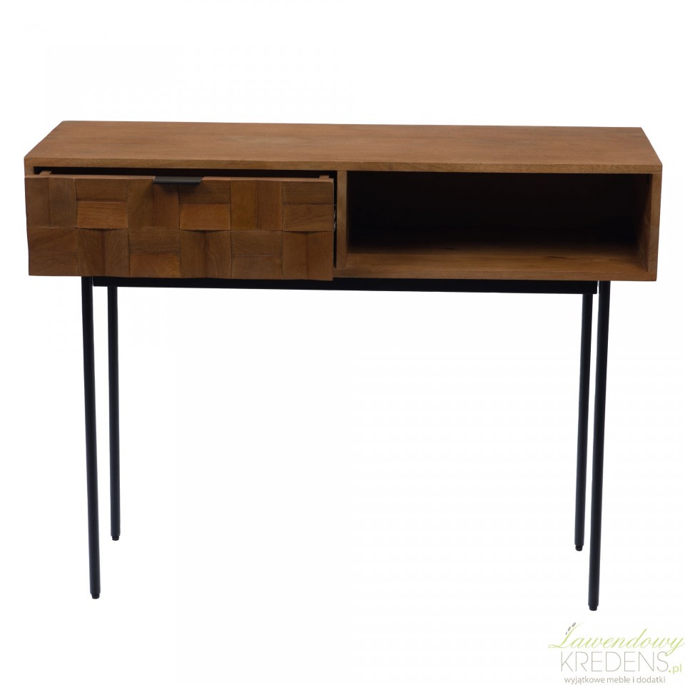 Połączenie drewna mango, metalu i płyty MDF sprawia, że konsola jest trwała, a jednocześnie estetyczna. Jasnobrązowy odcień drewna ociepla przestrzeń, a czarne nogi dodają jej loftowej lekkości. Dzięki otwartej półce i szufladzie mebel oferuje praktyczne rozwiązania do przechowywania drobnych przedmiotów.