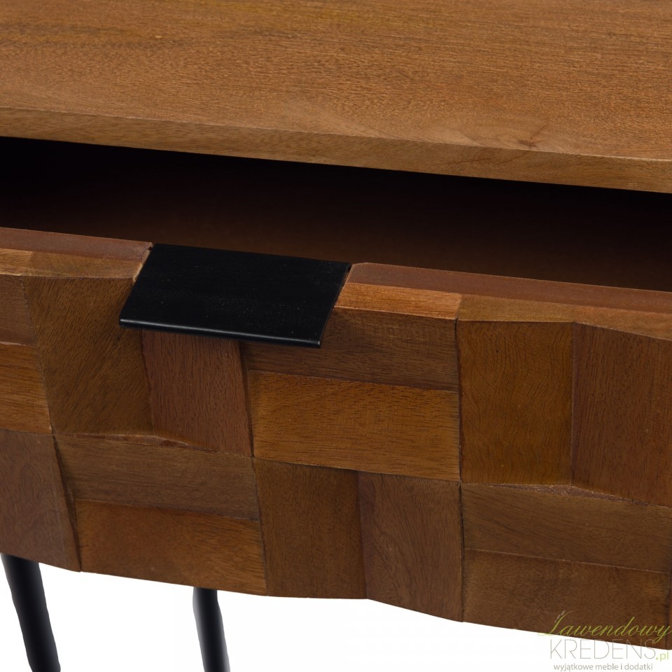 Konsola loft mango to mebel, który łączy nowoczesny minimalizm z naturalnym urokiem drewna. Jej prostokątna forma, smukłe metalowe nogi i ozdobna szuflada o geometrycznym froncie czynią ją wyjątkowym elementem aranżacji. To konsola, która sprawdzi się zarówno w stylu industrialnym, jak i w japandi czy rustykalnym, wprowadzając do wnętrza harmonię i charakter.