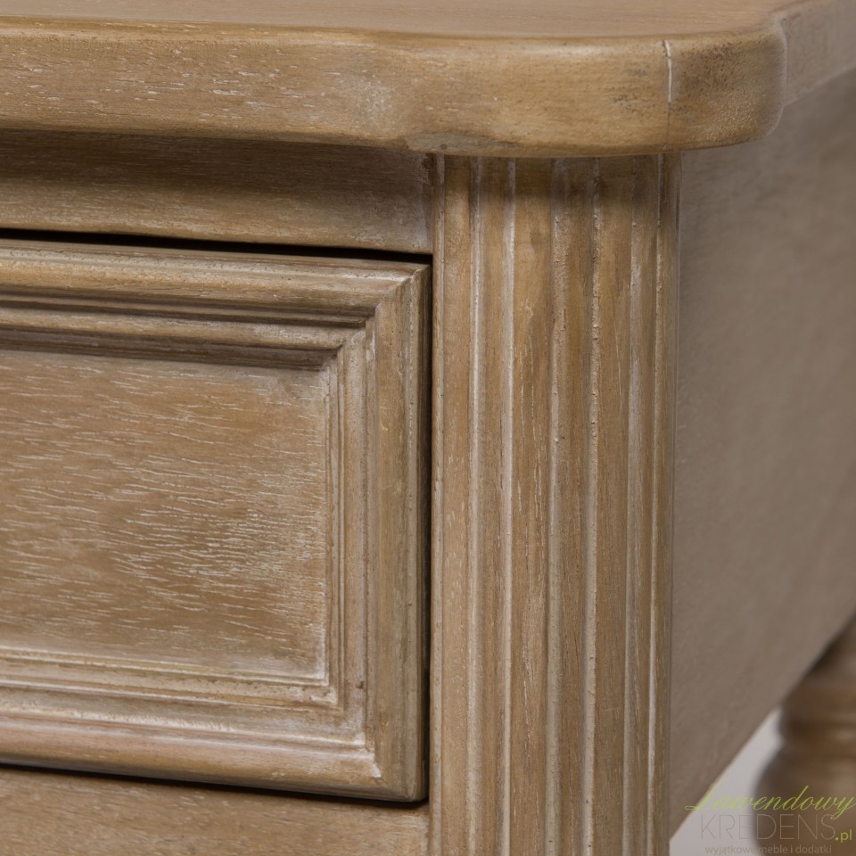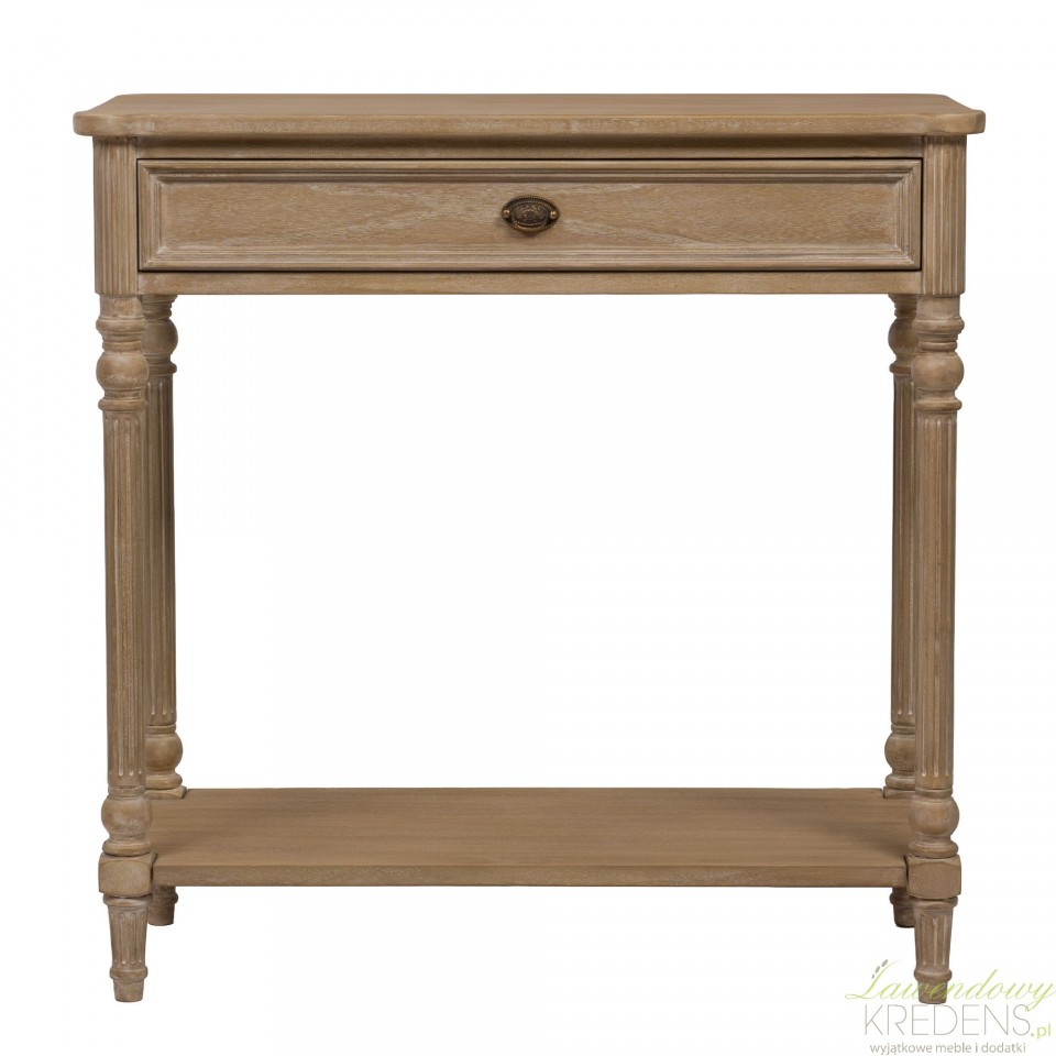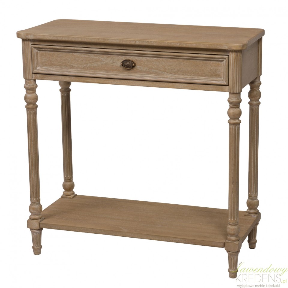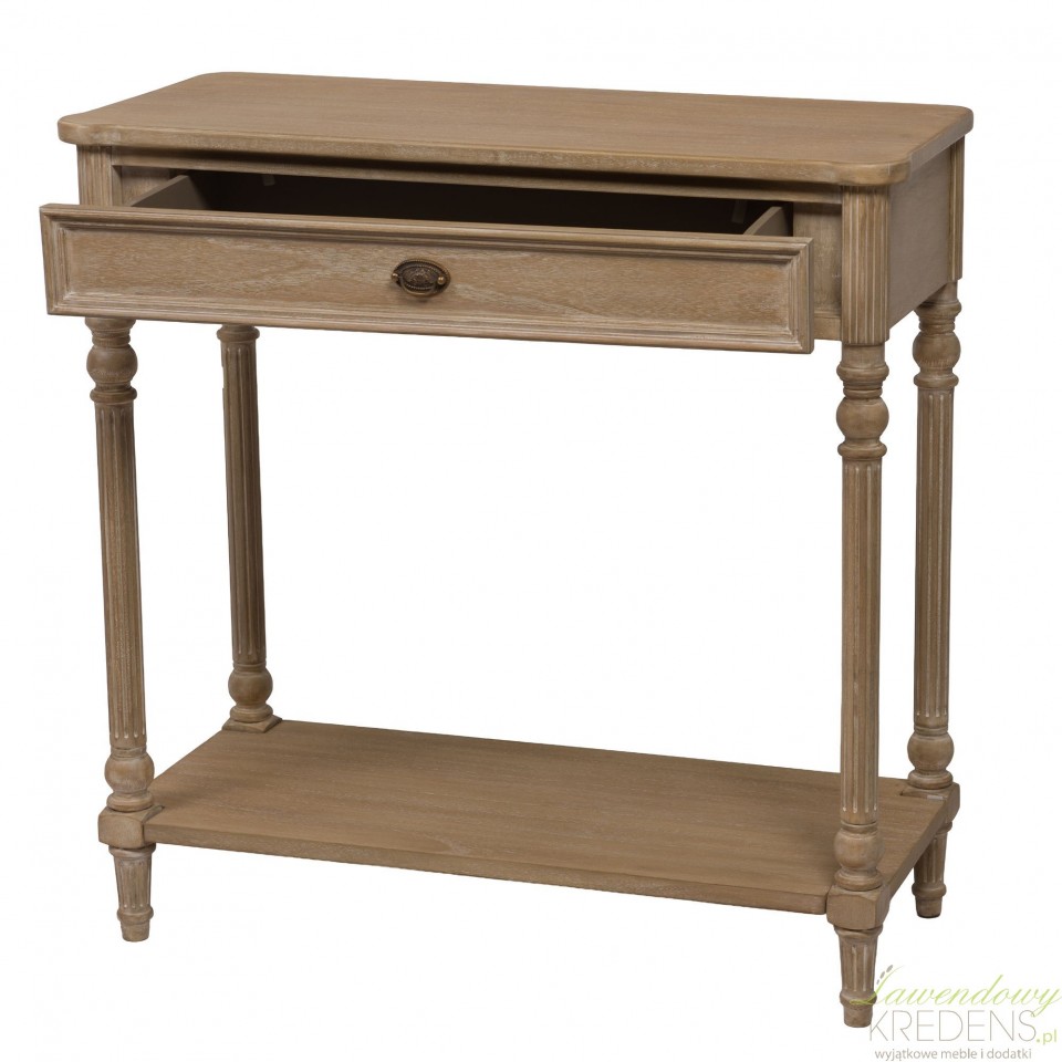 Wykończenie w kolorze brązowym z delikatnym bieleniem nadaje meblowi wyjątkowej lekkości i świeżości. Konsola doskonale wpisuje się w styl prowansalski, wprowadzając do wnętrza romantyczny klimat inspirowany francuską wsią, a także w rustykalne aranżacje, gdzie liczy się naturalność i prostota. To mebel, który pięknie prezentuje się zarówno w przedpokoju, jak i w salonie, sypialni czy jadalni.