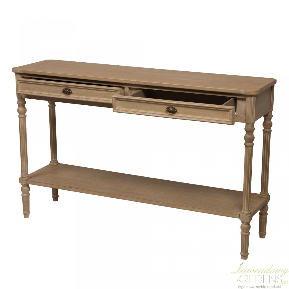 Konsola ma wymiary 130 × 80 × 35 cm, dzięki czemu jest smukła, a jednocześnie oferuje sporą powierzchnię użytkową. Wyposażona w dwie szuflady z ozdobnymi uchwytami oraz dolną półkę, umożliwia wygodne przechowywanie i ekspozycję. To idealne miejsce na drobiazgi, dekoracje, lampy stołowe czy wazony z kwiatami. Solidne wykonanie z drewna i MDF zapewnia trwałość, a eleganckie wykończenie dodaje lekkości całej bryle.