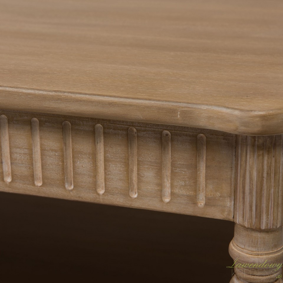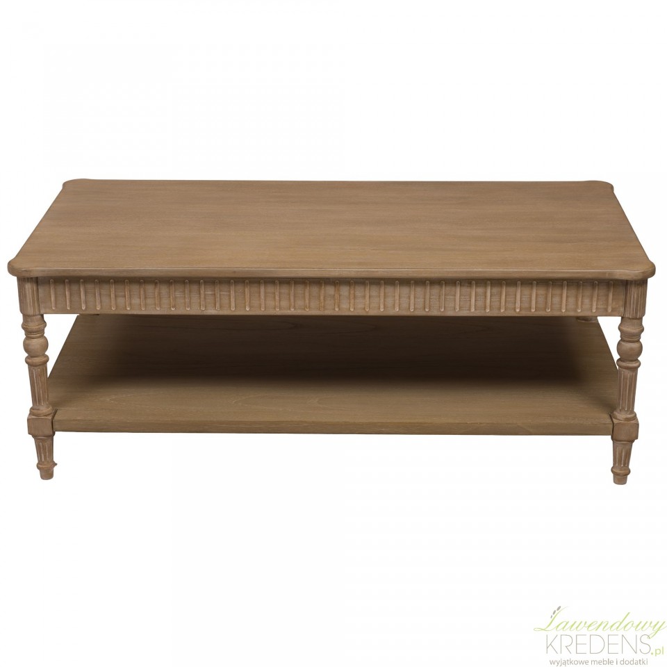 Stolik ma wymiary 120 × 60 × 45 cm, co czyni go centralnym punktem salonu. Szeroki blat staje się idealnym miejscem na filiżankę kawy, książkę czy wazon z kwiatami, a dolna półka pozwala uporządkować drobiazgi, pledy czy ulubione magazyny. Konstrukcja z drewna i MDF gwarantuje trwałość, a jednocześnie zachowuje lekkość charakterystyczną dla stylu prowansalskiego.