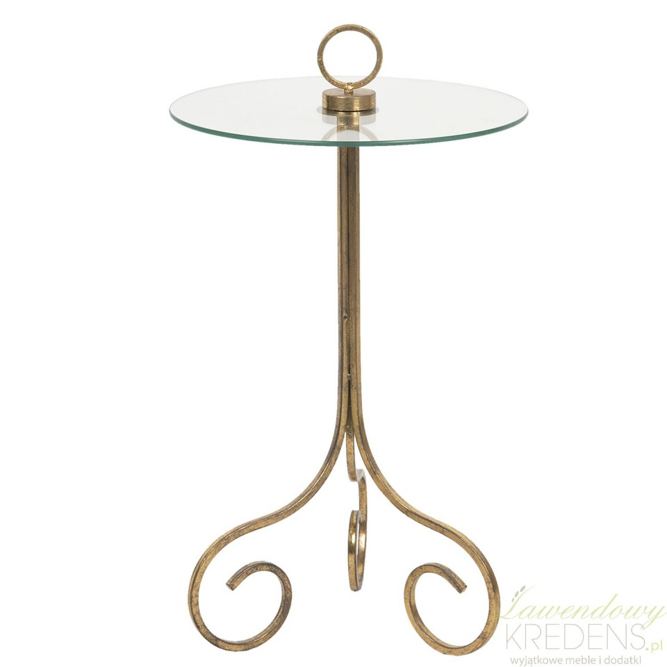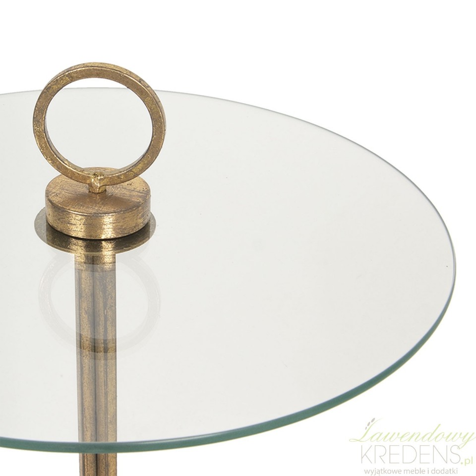 Na zdjęciu wysoki stolik ze szklanym blatem ze złotymi, fantazyjnie podwiniętymi nogami. Nogi wykonane są z metalu, malowane na złoto i delikatnie przecierane. Najbardziej efektownie wygląda uchwyt w centralnej części transparentnego blatu, który wygląda jak intrygująca dekoracja. Stoliki ze szklanym blatem to niewątpliwie eleganckie meble, gdzie dodatek złota odzwierciedla pałacowy nastrój.