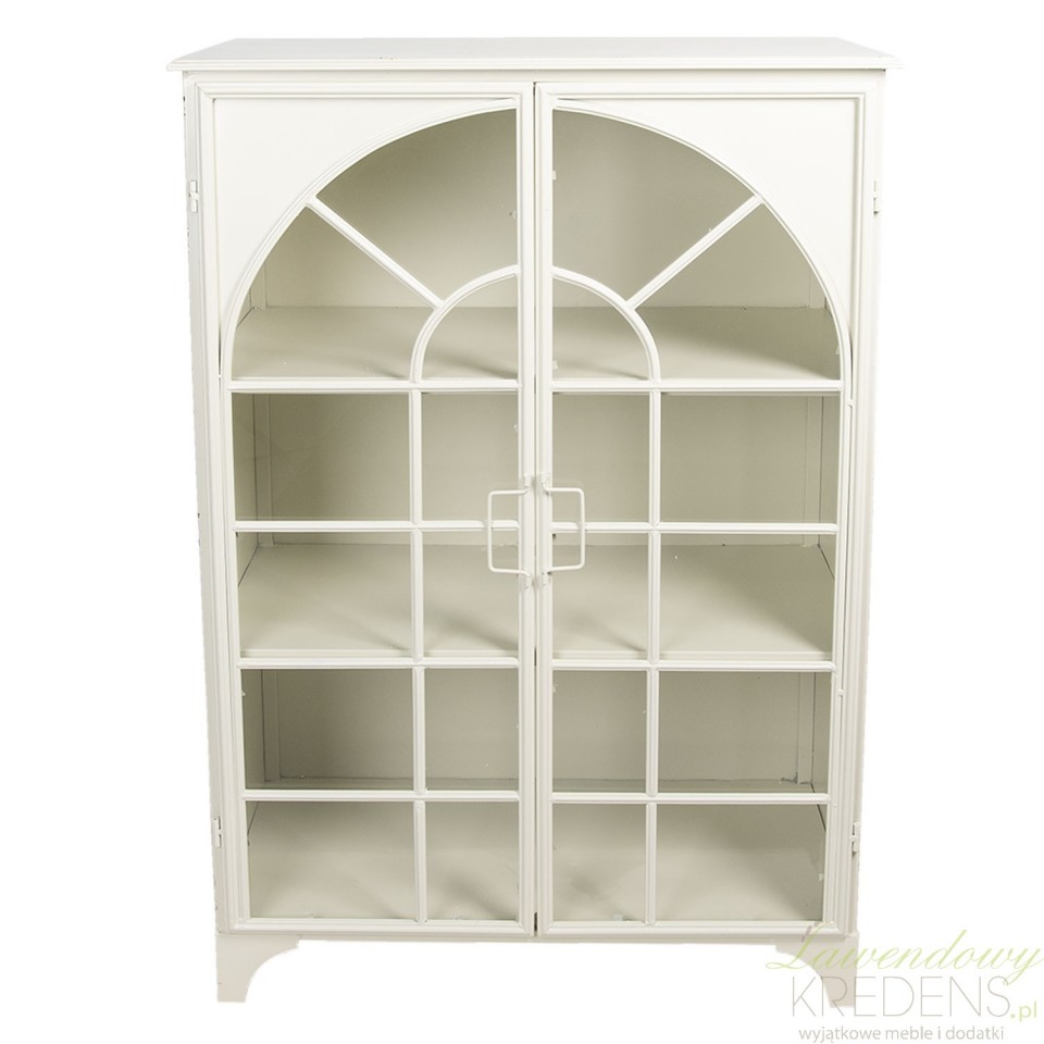 Przeszklona, metalowa komoda malowana na kremowy kolor ma drzwi w kształcie okiennic, dzięki czemu sprawdzi się między innymi we wnętrzach francuskich i prowansalskich.