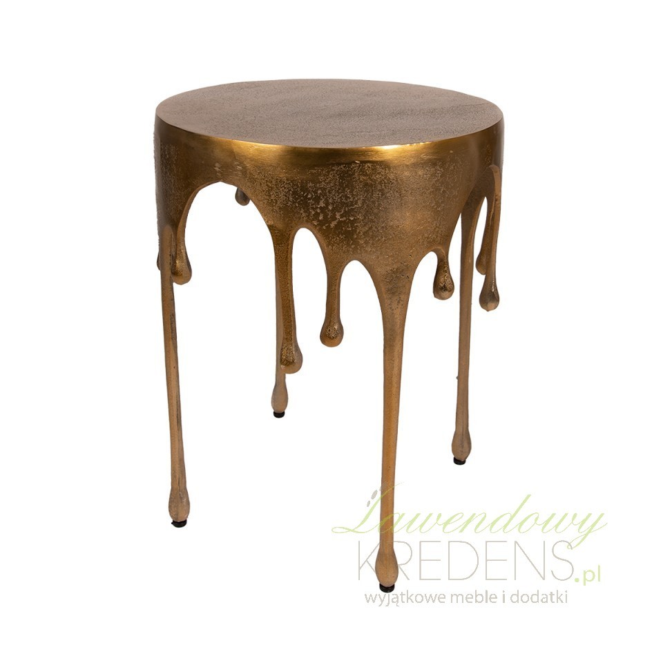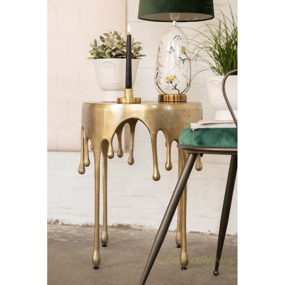 Ten stolik wykonany jest z metalu w pięknym kolorze mosiądzu. Mierzy 56 cm wysokości i ma 43 cm średnicy. Podoba nam się jego oryginalny blat, który wygląda jakby ze stolika spływały krople. Prezentowany mebel znajdzie więc swoje miejsce obok sofy w salonie, posłuży jako stolik pomocniczy i ozdobi przestrzeń pięknym kolorem. Metalowy stolik krople Clayre & Eef to przydatny element wyposażenia domu. Już teraz sprawdź pozostałe meble Clayre & Eef nawiązujące wyglądem do stylu glamour!