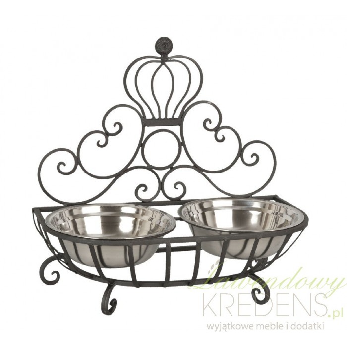 Dwie srebrne miski dla psa lub miski dla kota, zostały umieszczone na metalowym stojaku o ciemnym kolorze. Posiada on ozdobny dekor przypominający koron. Dodatki w stylu prowansalskim dzięki którym nawet zwierzaki poczują się wyjątkowo.