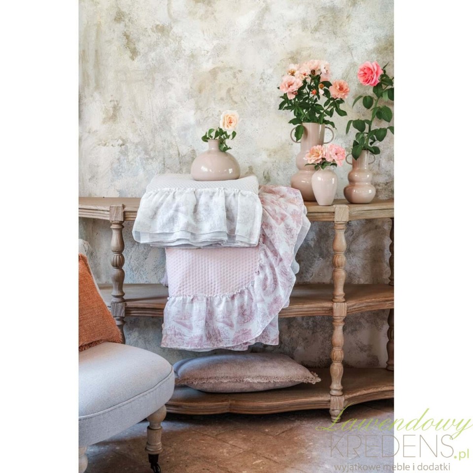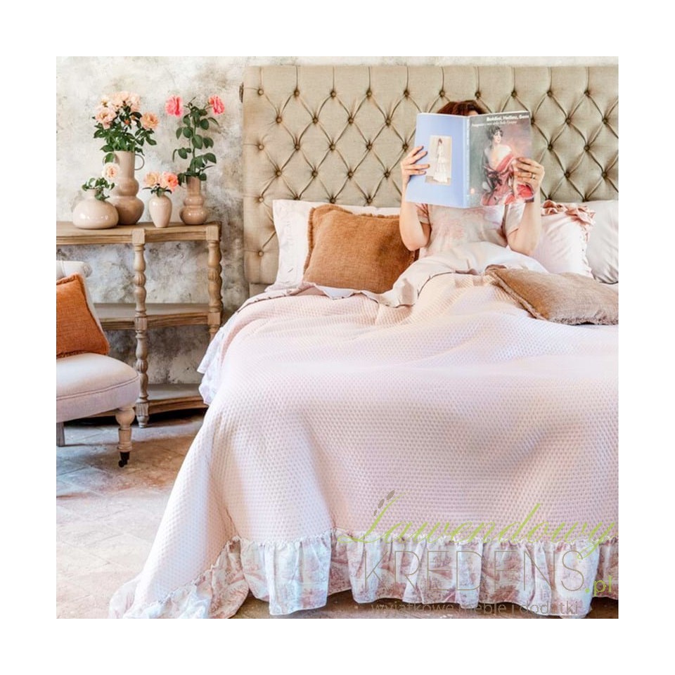 Jeśli chcesz szybko ocieplić sypialnię i „ukryć” codzienny nieład na pościeli, narzuta na łóżko z falbaną A Blanc Mariclò daje efekt hotelowego porządku w minutę. To wybór do wnętrz w klimacie shabby chic, prowansalskim i cottage: miękkie światło, jasne beże, len, patyna i rzemieślnicza tekstura tkanin.