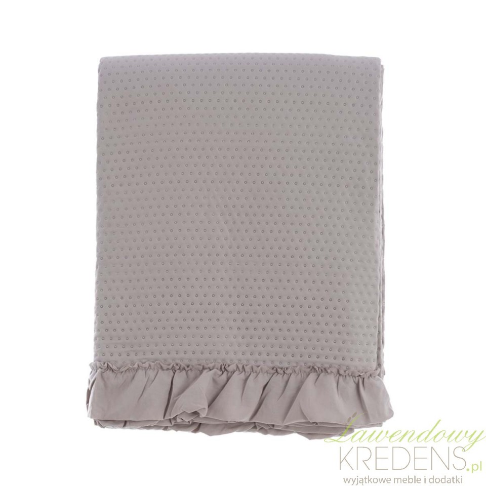 W narzucie liczy się nie tylko kolor, ale też „czytelną” fakturę. Tu pracuje delikatna tekstura materiału, która wygląda naturalnie i dobrze łączy się z lnem, bawełną oraz postarzanym drewnem. Falbanka porządkuje linię łóżka, maskuje krawędzie pościeli i tworzy wrażenie dopracowanej stylizacji bez nadmiaru ozdób.