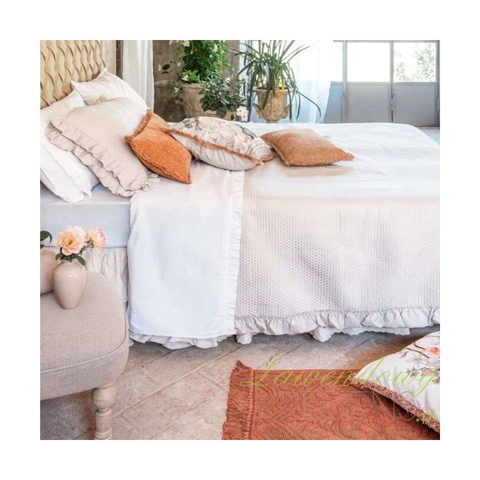 Jeśli chcesz, by łóżko wyglądało schludnie od rana do wieczora, a jednocześnie zależy Ci na przytulności bez „hotelowego chłodu”, ta beżowa narzuta z falbanką Blanc Mariclò rozwiązuje problem w jednej warstwie. Beż ociepla wnętrze, a falbanka dodaje miękkiego, rzemieślniczego charakteru typowego dla romantycznych aranżacji Provence i cottage.