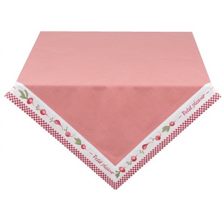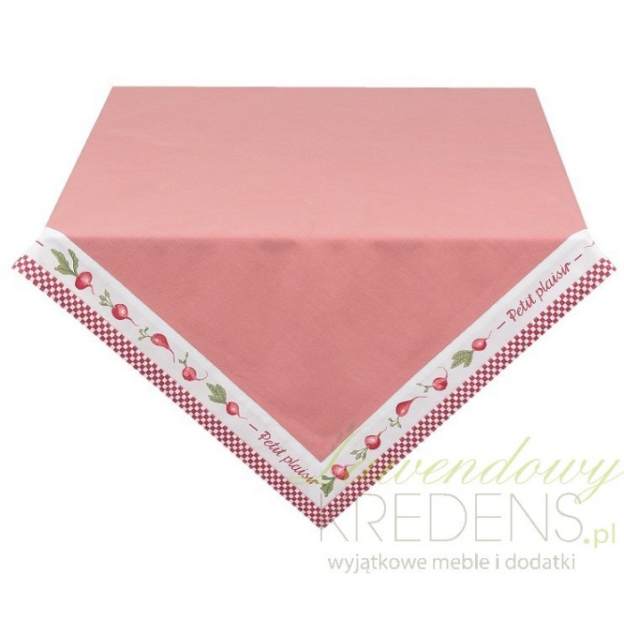 Czerwony obrus wykonany jest z wysokiej jakości stu procentowej bawełny. Ma kwadratowy kształt i śliczną dekorację w postaci dekoracyjnej czerwonej rzepy oraz francuskiego napisu. Bawełniany obrus jest bardzo trwały i wspaniale sprawdzi się na wszystkich uroczystościach.