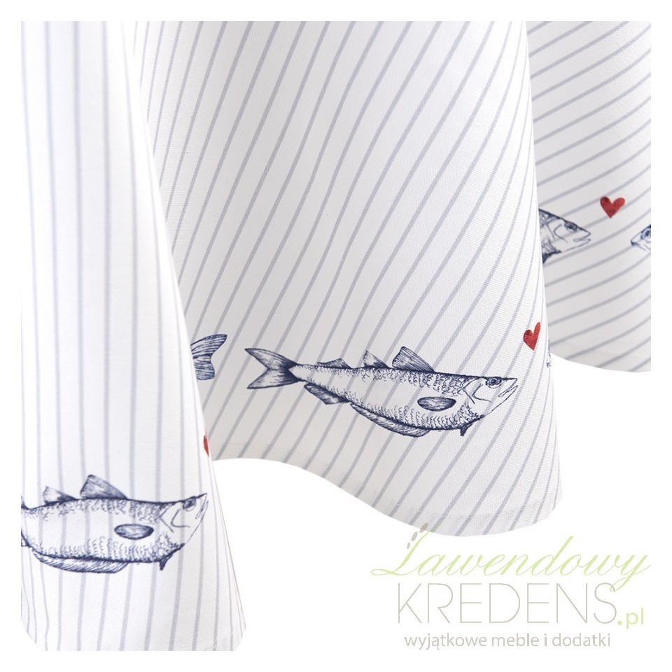 Ten biały, okrągły obrus w granatowe paski z uroczym motywem ryb, bez wątpienia przyciągnie uwagę Twoich gości. Jego wysokiej jakości bawełniana tkanina gwarantuje trwałość i miękkość dotyku, podkreślając jednocześnie autentyczny styl marynistyczny.