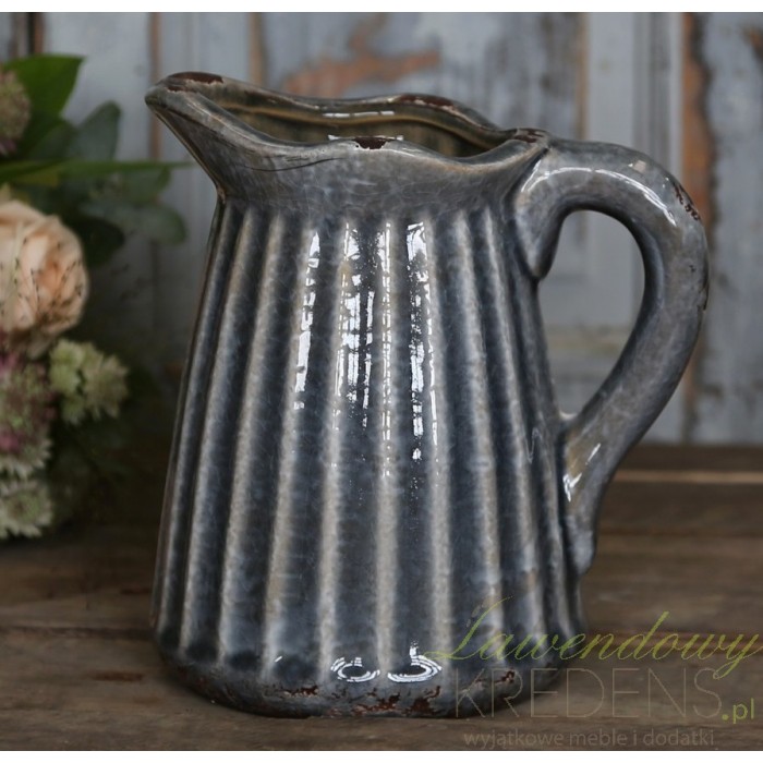 Dzbanek ceramiczny z kolekcji Old Chic w kolorze brudnego niebieskiego zdobiony podłużnym prążkami.