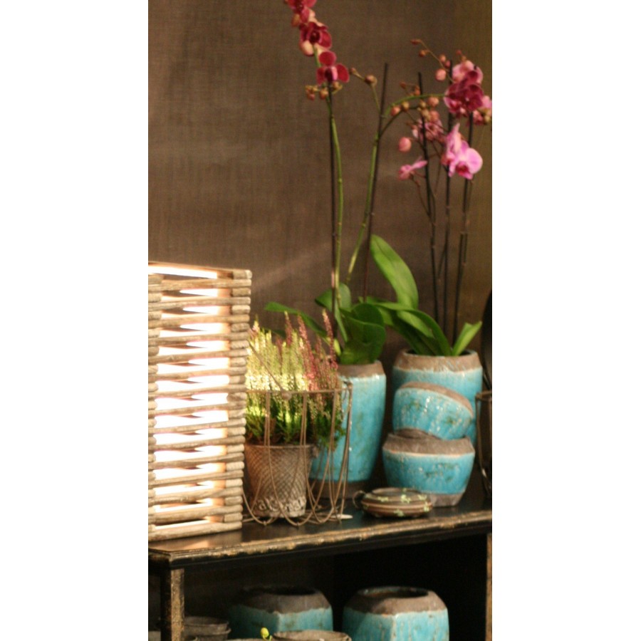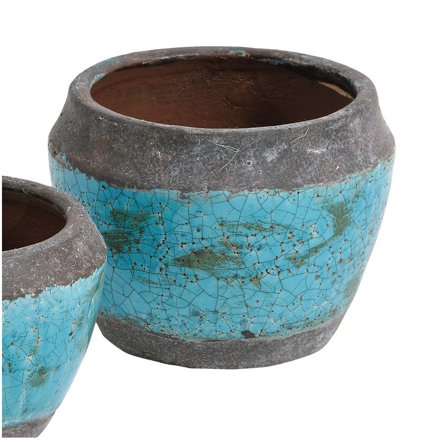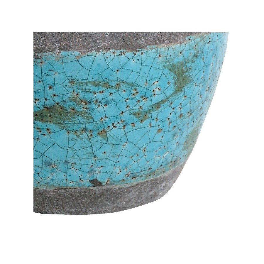 Prowansalskie osłonki Belldeco z serii Azzurro, stylizowane na starą ceramikę. Podstawa i górna część osłonki jest surowego, ciemnoszarego koloru i nie jest szkliwiona, natomiast środkowa część osłonki o przepięknym, błękitnym kolorze jest szkliwiona, a na jej powierzchni znajdują się urocze spękania oraz delikatne wgłębienia.