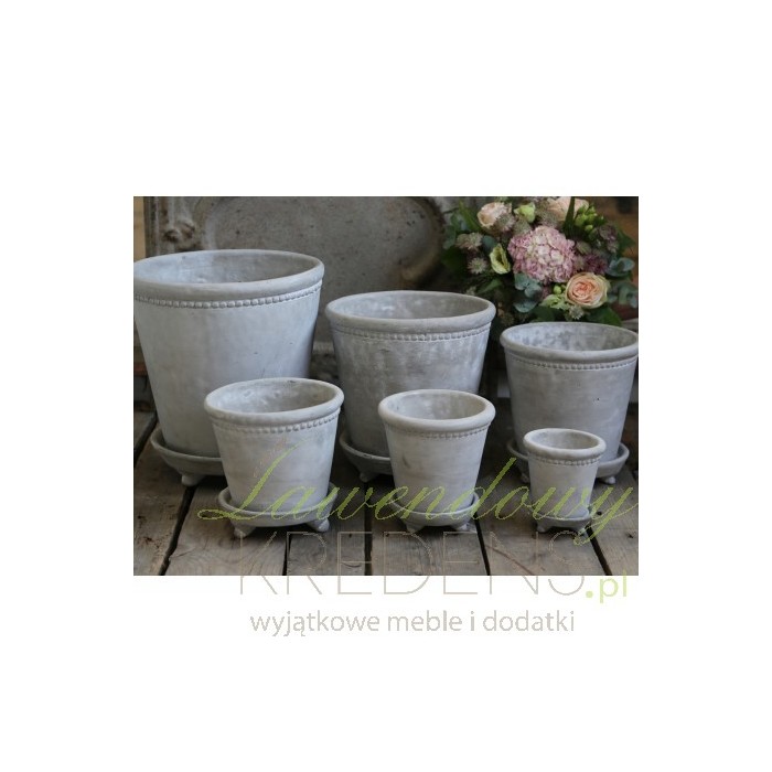 Prostej formy szara osłonka na doniczkę z dekoracyjną krawędzią, która przypomina sznur malutkich koralików!
