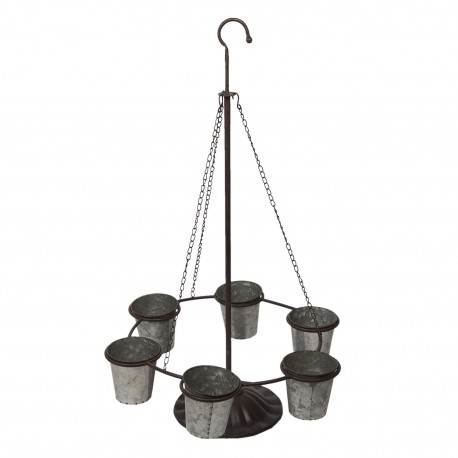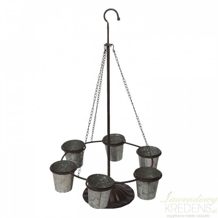 Duża osłonka na doniczki to metalowy stojak z hakiem i okrągłymi pojemnikami zamocowanymi do okręgu.