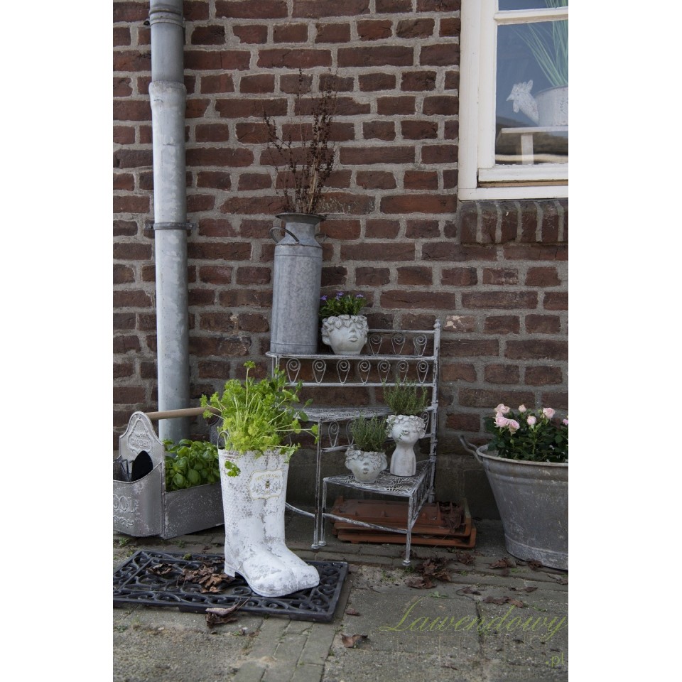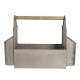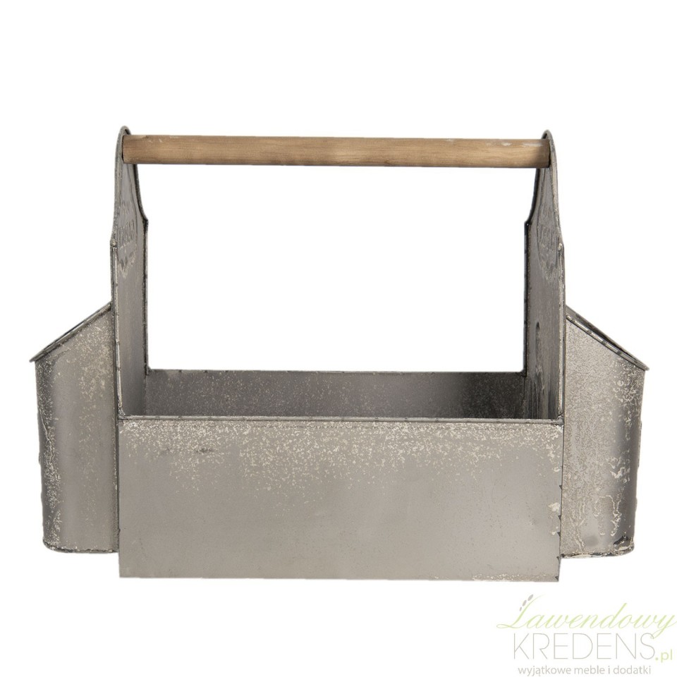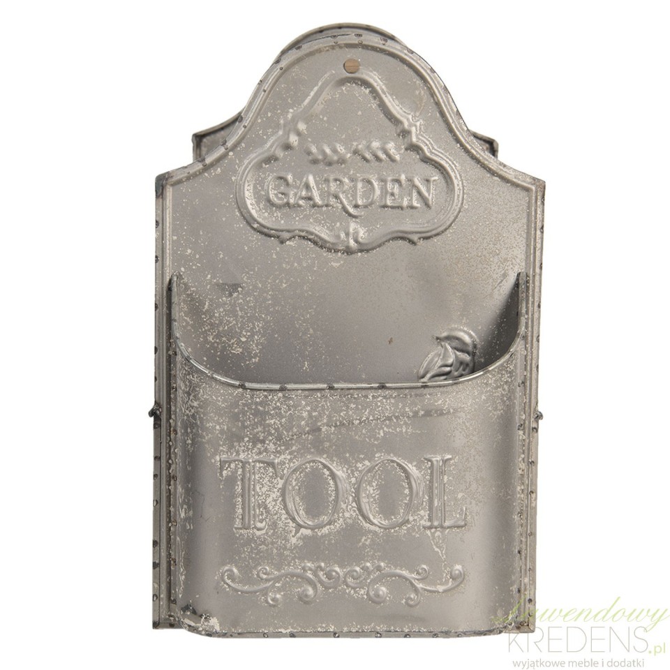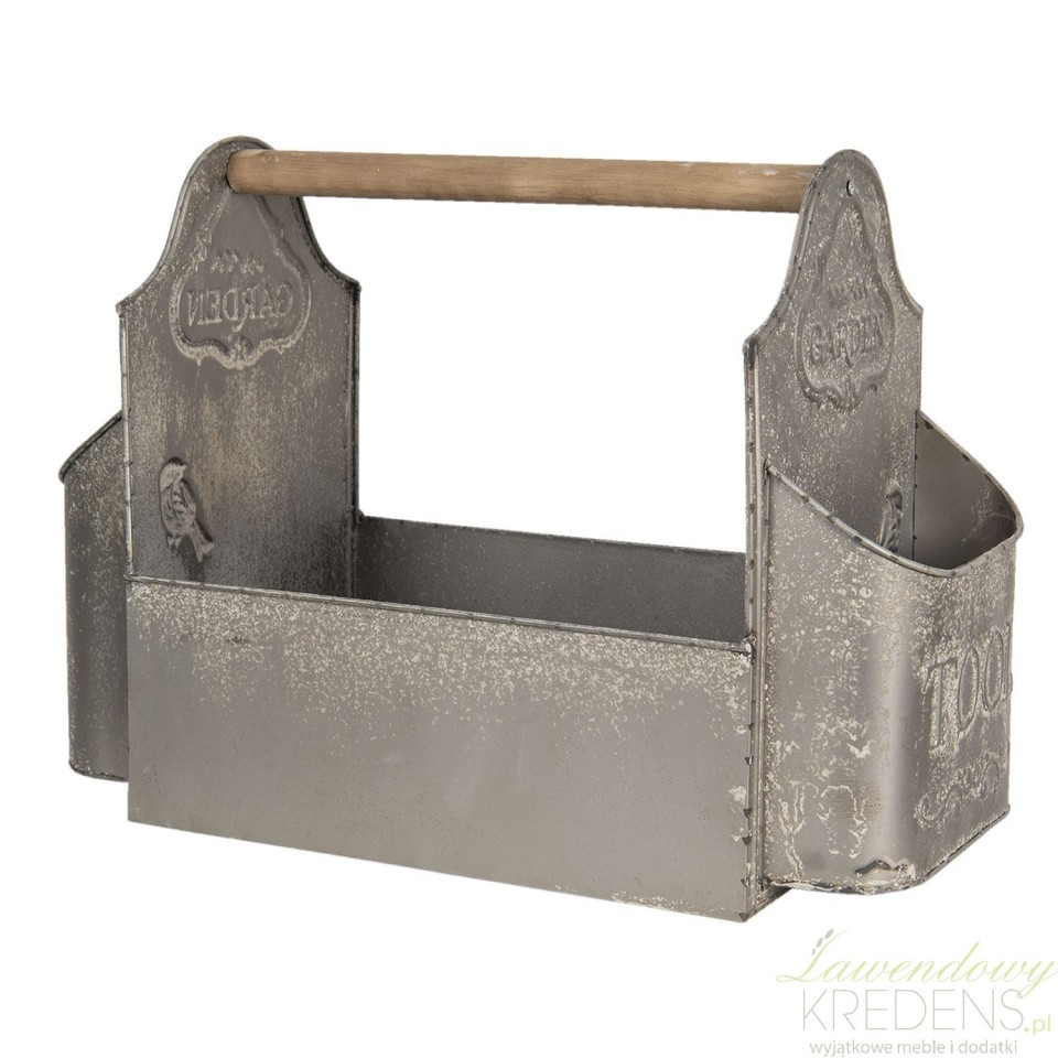 Skrzynka z rączką ma kształt zbliżony do prostokątnej bryły. Jej boczne krawędzie są wyższe niż fronty, a w dodatku znajdują się na nich dodatkowe "kieszonki". Metalowa skrzynka ma szary, antyczny koloryt i ciekawe dekoracje w formie wytłaczanych napisów "Tool" i "Garden". Metalowe skrzynki to akcesoria, które z pewnością przydadzą się w ogrodach.